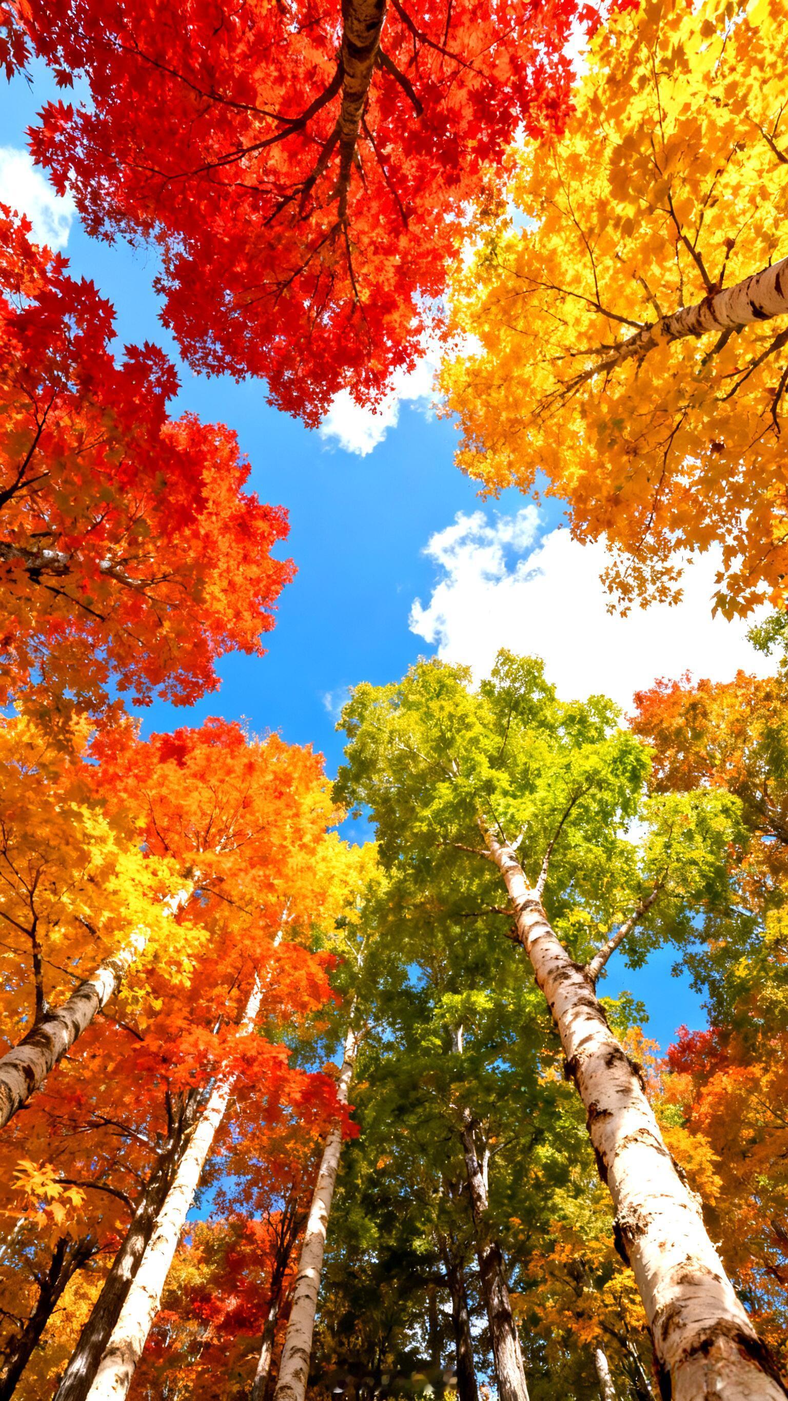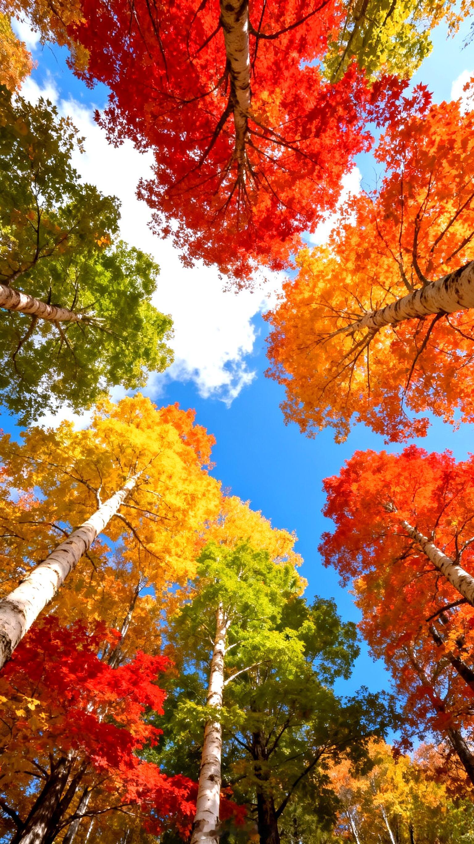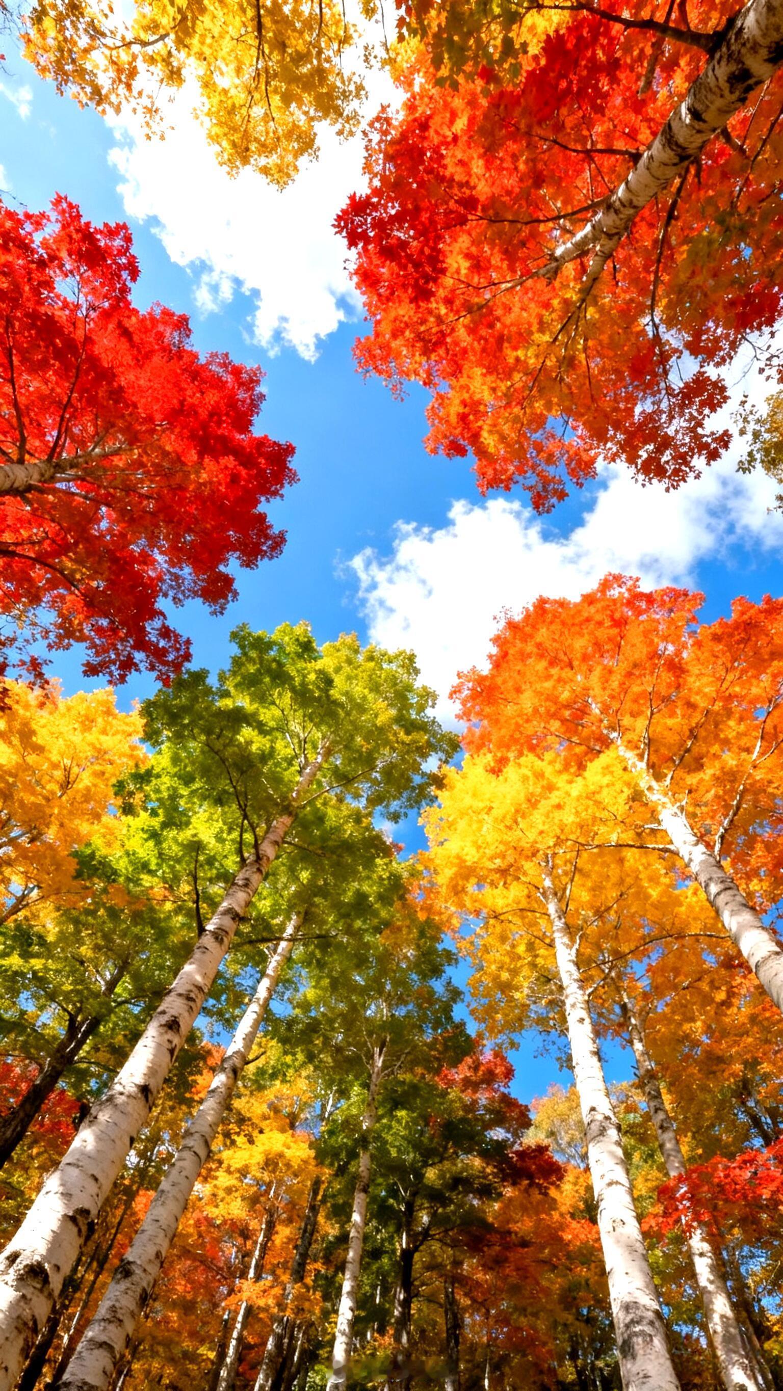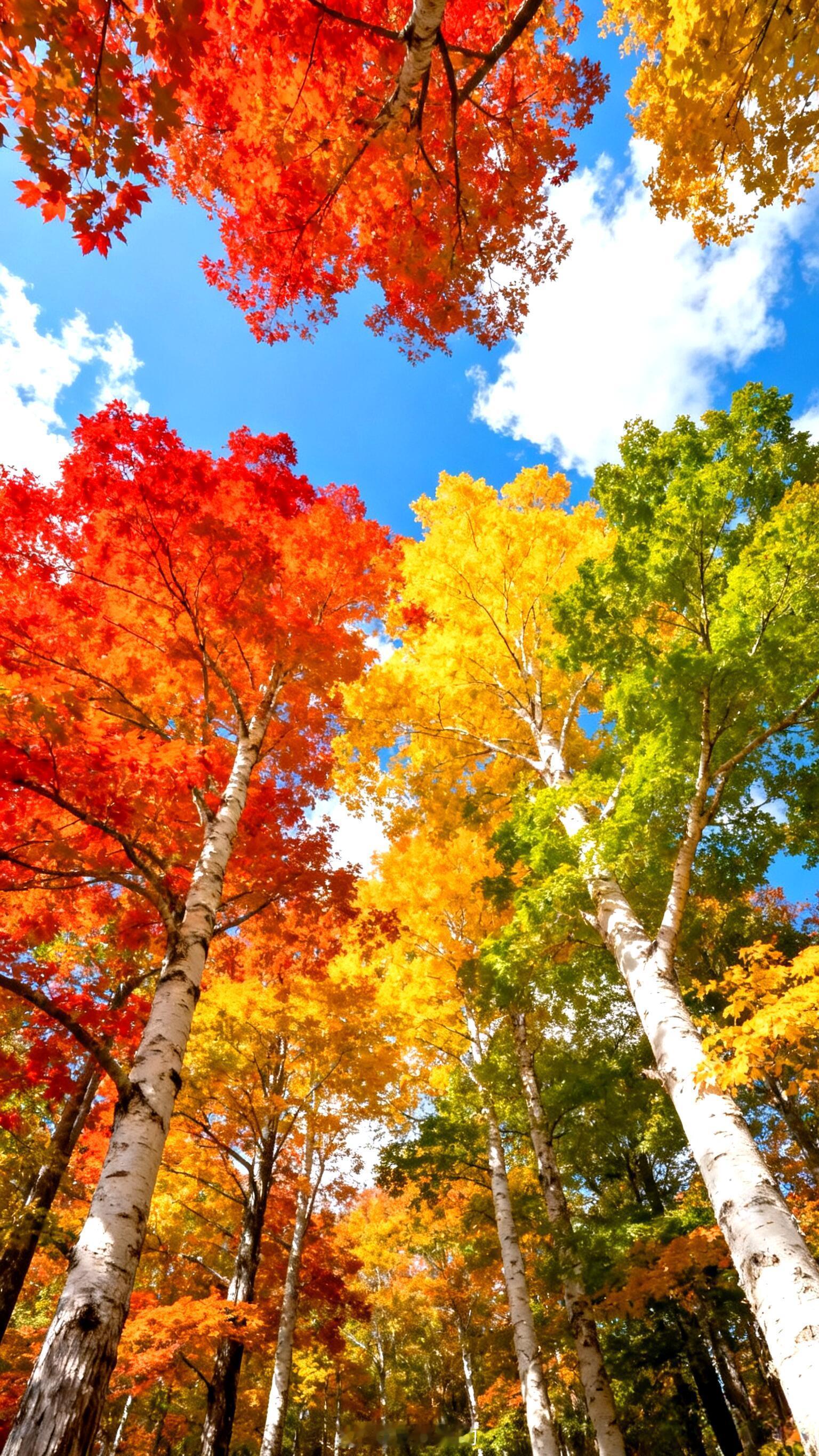 生活手记 在树林里一抬头,直接被这景色砸中了心巴红的像熟透的浆果、黄的像融化的芝士、还有没褪尽的夏绿,层层树叶把蓝天切成了棉花糖似的形状,阳光从缝隙里筛下来,暖得人心里发软~