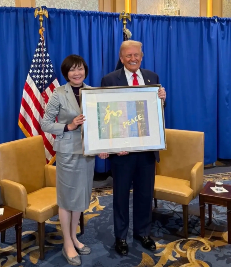 而安倍昭惠也是很投川普的爱好,特地送了一个刺绣给川普,上面刺着和平,可能是安慰川普没有获得诺贝尔和平奖的遗憾。