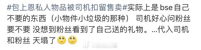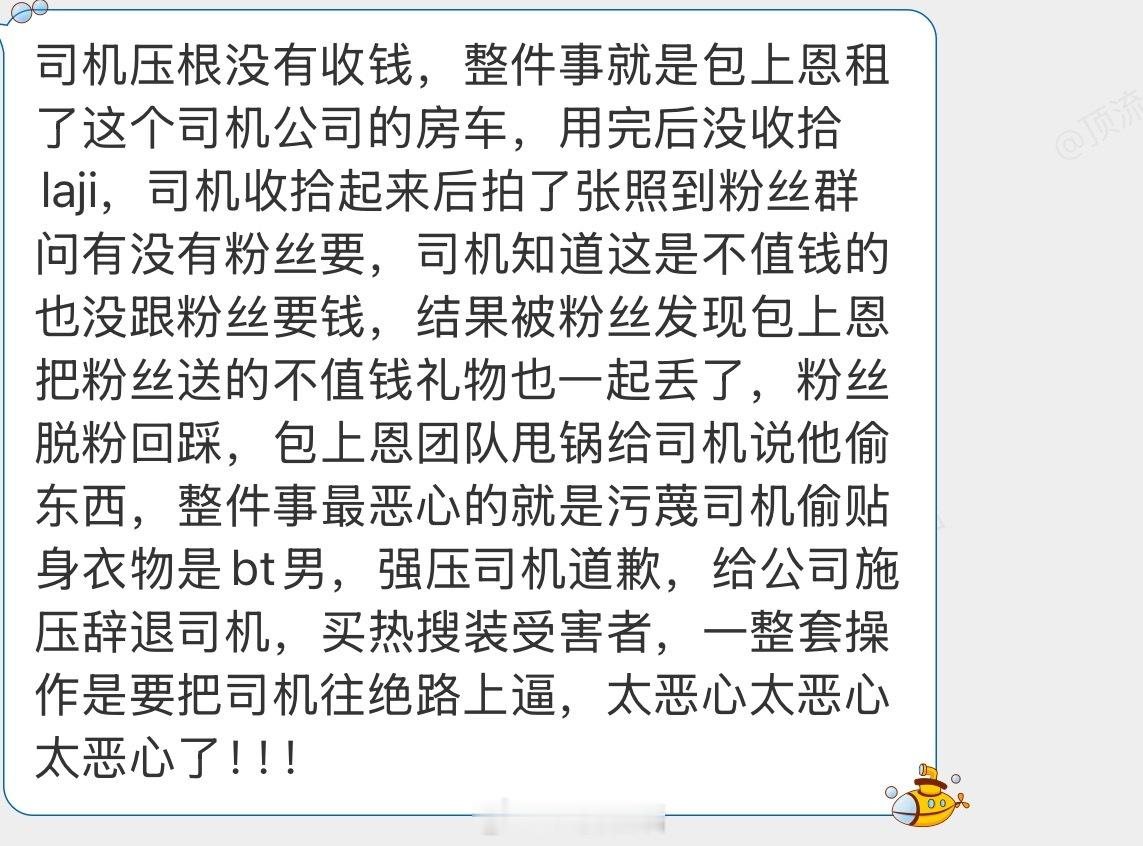 包上恩司机内娱司机已经成了高危职业。 整个事件的真相是租了房车留下不要的垃圾,司机拍照在粉丝群问有没有人要,结果粉丝发现其中有粉丝送给包上恩不值钱的礼物也被丢弃,粉丝脱粉回踩,包上恩甩锅司机。还要恶意污蔑司机拿她贴身衣物,舆论往xsr,bt方向引导,强迫司机道歉。真下头啊。傲慢的208。