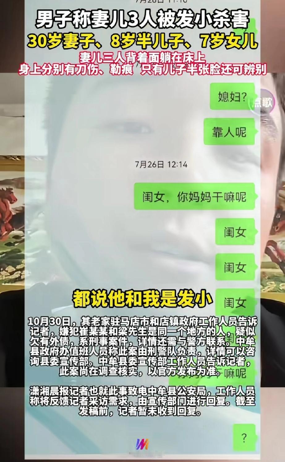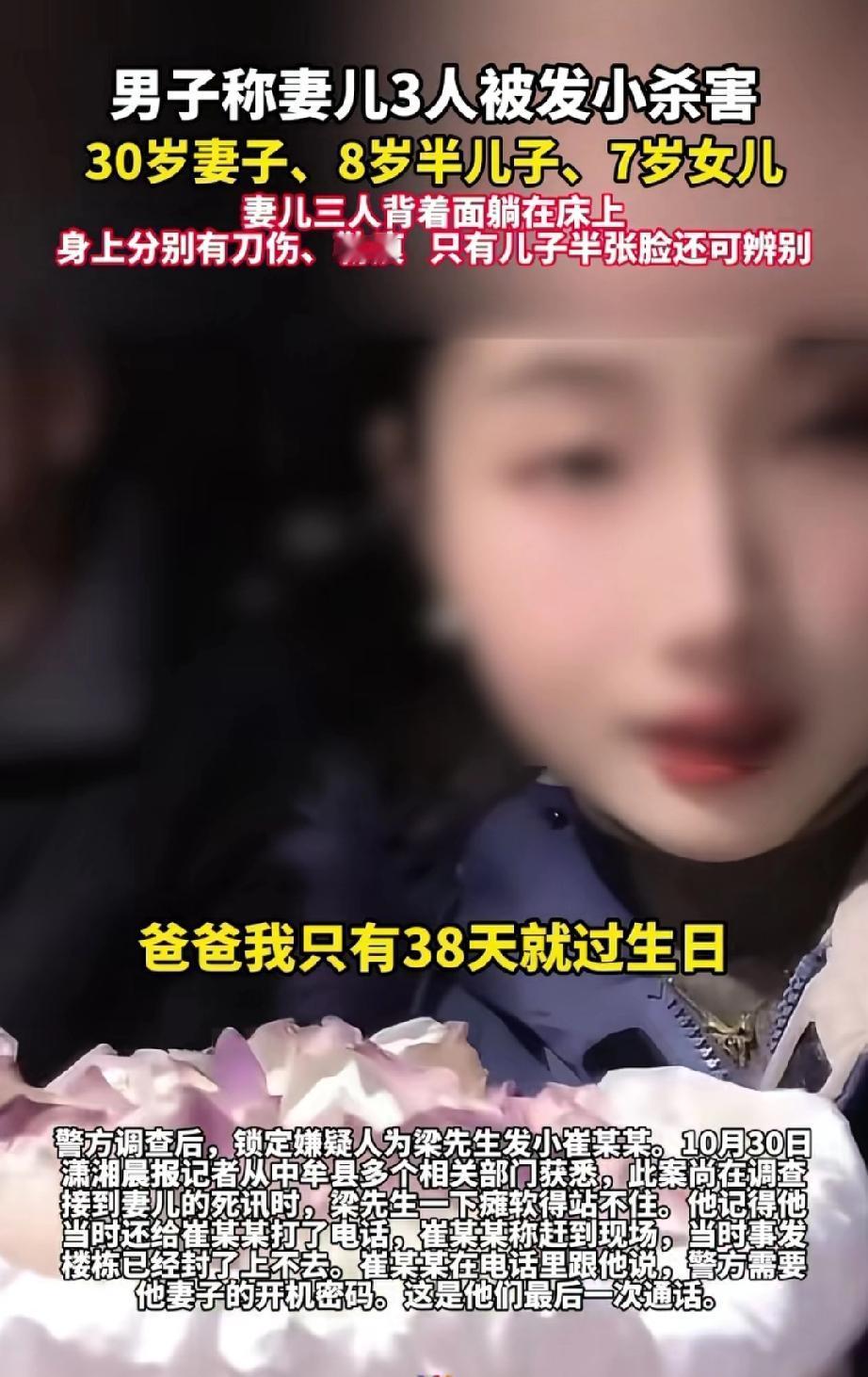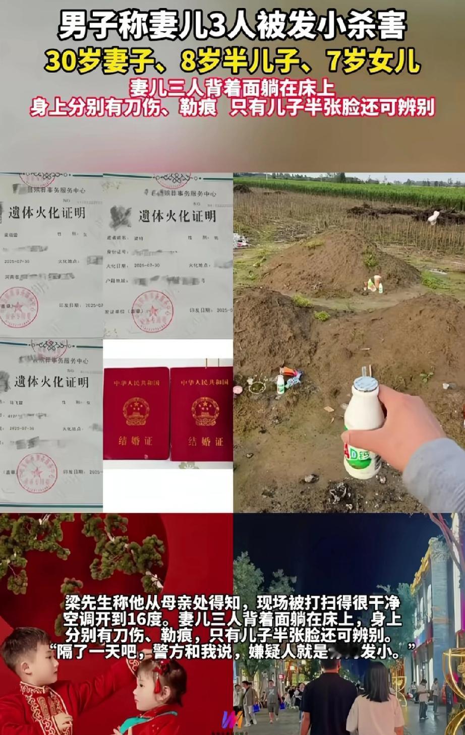 河南一名在湖北务工的男子,前一晚还与妻子视频聊天,次日却再也联系不上她。他赶忙让发小去家里看看,发小却借口有事推脱。 男子只好联系父母,竟得知妻子和两个孩子已离世的噩耗。 妻子年仅30岁,儿子8岁,女儿7岁。 三人惨遭他人迫害。 男子听闻,瞬间瘫软在地,不敢相信这是真的,心急如焚地往家赶。 此时,他接到发小电话,对方称警方需要妻子手机的开机密码,此后便再也联系不上发小。 事情发生在今年7月26日,截至目前调查仍未结束。 据硕,是发小偷偷配了男子家的钥匙,半夜入室盗窃,被妻子发现后,因害怕她将此事说出去,便起了歹念。 据村里人的说法,发小疑似在外面欠下巨额债务。 男子失去了相濡以沫的妻子和两个天真可爱的孩子,仿佛天塌了一般,每日以泪洗面,只求能得到一个真相、一个结果。 男子的抖音里,还留存着与妻子结婚时相拥亲吻的视频,有一家四口出游的画面,更有两个孩子灿烂的笑容。 耳边余温未散——是妻子说晚安时的娇嗔,是女儿叫爸爸的柔软,还有儿子心心念念的期盼:“爸爸,再等38天,就是我的生日啦!” 如今,一切都没了,只剩下永远的思念和无法愈合的伤痛。 识人先识德,交友先交心。德行不佳之人,即便身上有再多光环,也不可与之深交。及时远离,才能避开暗礁,让前路更稳、心境更宁。 来源:看看温州