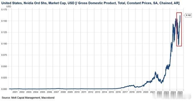 而当下,英伟达的市值相当于美国GDP的16%。 并已超过2024年第四季度创下的15%的先前高点。 (见图二)