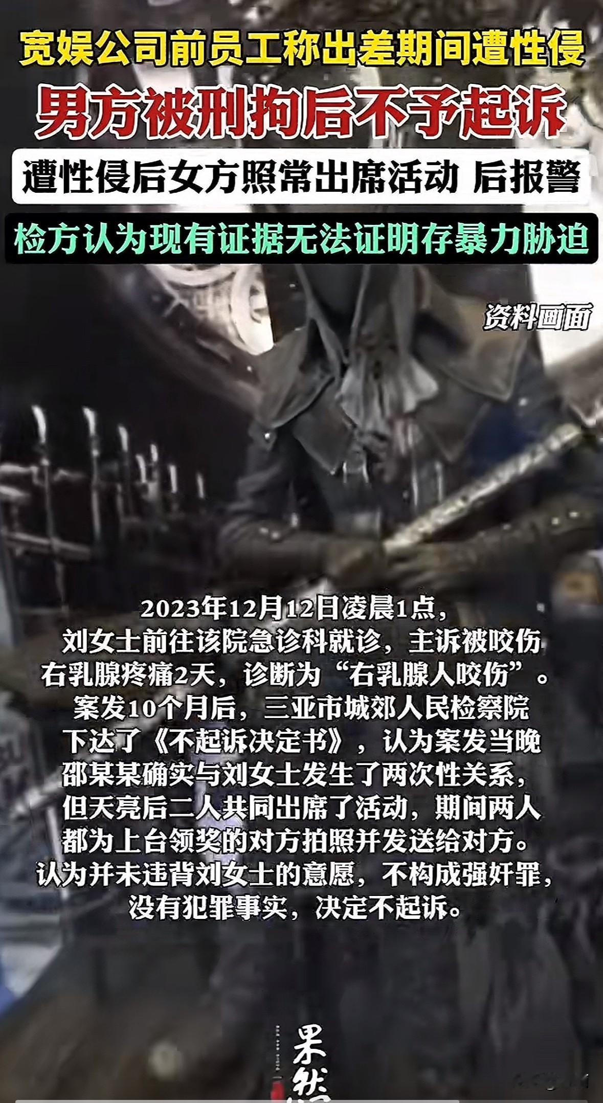 宽娱前员工刘女士出差三亚时,被对接人邵某某性侵。她有指甲撕裂、乳房咬伤的伤情,提交了撕扯痕迹的睡裤当证据。警方立案刑拘邵某某后,两级检察院以证据不足、无法证明违背意愿为由不起诉,还指出办案程序有违法问题。刘女士称当时强撑参会是怕影响工作,并非自愿,后续她被公司以考勤为由辞退,劳动仲裁还在调解。 性侵案里“违背意愿”不只有明显暴力,职场孤立处境下的隐忍容易被误解。证据难固定让受害者维权难,希望司法能更细致认定这类情况。职场女性出差安全也该被重视,公司不能遇事就推责,该给受害者更多支持,而不是雪上加霜。