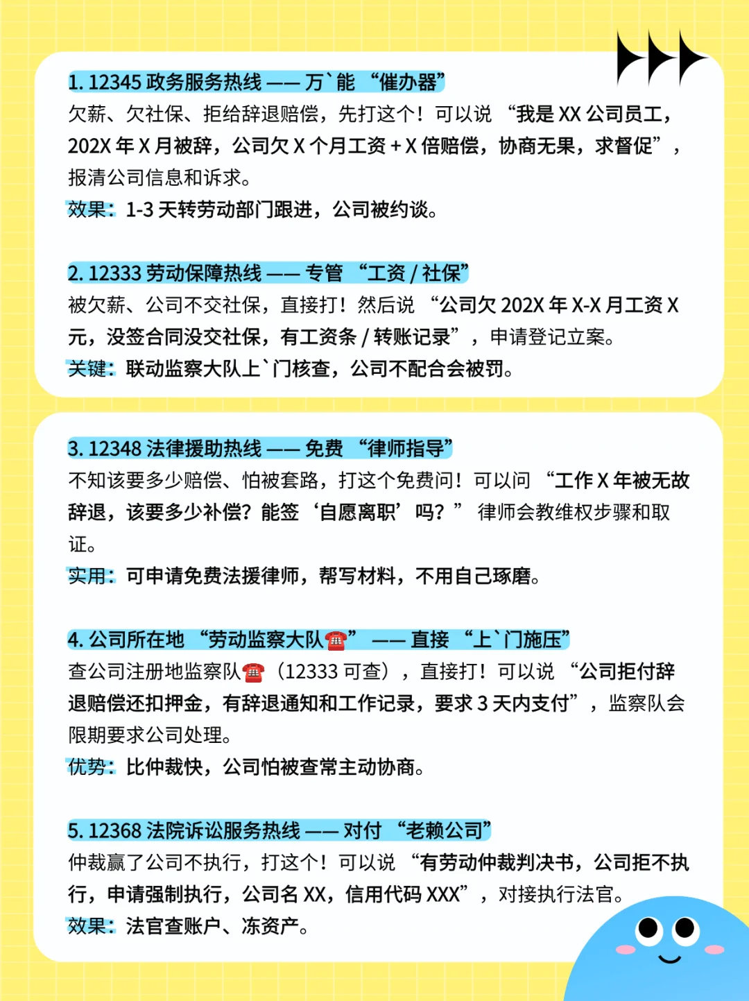 家人们!被欠薪、被辞拿不到赔偿,别瞎跑仲裁!这 5 个☎打通,赔偿常能快速到账,省时省力! 因字数有限,具体内容可以看【图片】哦~  别踩 2 个 “☎维权坑” ① “没证据乱打”:先备工资条、工作记录,说时有依据才管用; ② “打一次就放弃”:没回复隔 2 天再打跟进,别被公司拖延。  能靠☎解`决的,别跑仲裁!按顺序打这 5 个,多数赔偿能快速要到! [私信R] 若您面临这类情况,需要律师,这都有靠谱的本地律师为大家匹配哦~