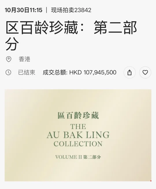 今日下午,“区百龄珍藏”第二部分拍卖以逾1亿港币圆满收槌,市场表现依然稳健。在浏览辉煌战绩之余,一个细节尤为耐人寻味:全场45件标的,其Lot号竟悉数避开了数字“4”!!! 这何尝不是一种最动人的致敬?以这般中国式浪漫,借一个刻意缺席的数字,向老先生那一代人所恪守的传统与风骨,致以最深长的敬意。在理性至上的商业场域里,这份无声的体贴,恰似一滴墨落入清水,晕染开的是千年文化积淀下,独有的人文温度。 这大概就是中国人血脉里的共鸣吧,对此大家怎么看呢,快来评论区交流分享![害羞R]
