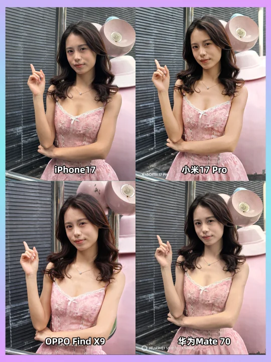打工人必看!市场zui火的四款旗舰,iPhone17(5999)、华为Mate70(约4699)、小米17 Pro(4999)、OPPO Find X9(4399) 四款机型都是当前入门级旗舰中的热门选手,拍照都很不错,大图除了色调的区别都挺好看🤩 放大看细节就有区别了,个人感觉Find X9放大后比较清晰,脸部看起来很有细节,又有Ultra级丹霞色彩还原镜头,没有一味选择美颜,脸部很自然。 按照你自己的喜好看,你喜欢哪一台旗舰的拍照效果?