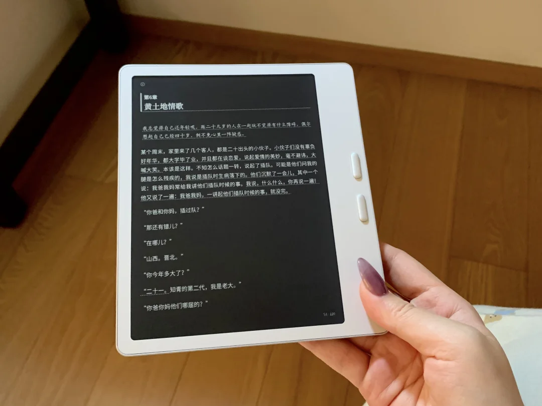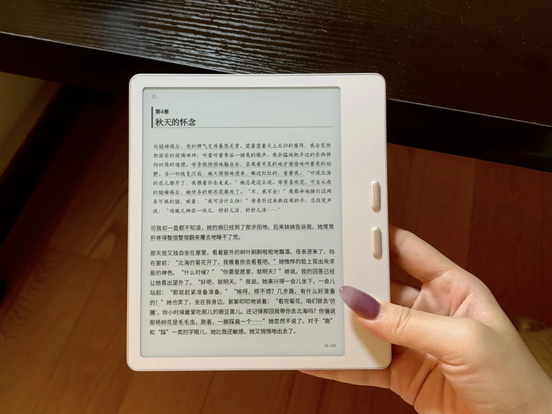 颜值也狠狠戳我,白色机身百搭好看!(还有点小贵气)轻薄得像本小画册,背板握把设计符合人体工学,单手就能握得很稳,就算早高峰挤地铁也能气定神闲。。轻按按钮翻页,贼丝滑。。现在排队等地铁、等咖啡的闲碎时间都被各种文字填满,这种沉浸感确实是手机给不了我的