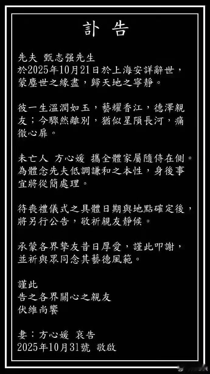 展昭饰演者甄志强离世! 享年59岁! 10月31日,演员甄志强妻子在微博发布讣告,甄志强于10月21日在上海去世。 今年5月,在社交平台上,甄志强曾发布一段视频,透露自己因身体不适入院。他在视频中提到:“危险在出现时,往往没有预警。”10月20日,也就是他去世前一天,其社交账号还在发布视频。 公开资料显示,甄志强1967年9月17日出生于中国香港,中国香港男模特、演员,曾出演《碧血青天杨家将》《法证先锋2》《与敌同行》等,被观众誉为“最帅展昭”。