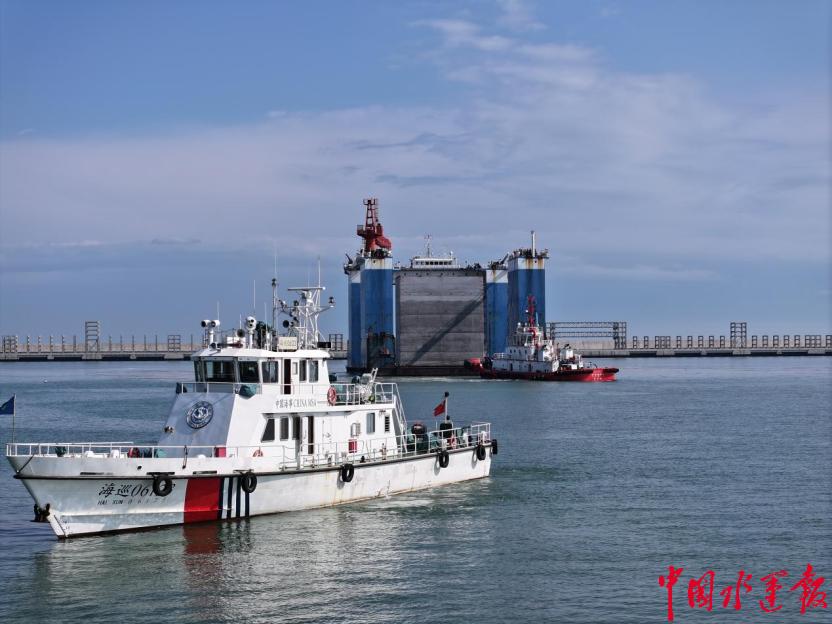 该项目本阶段出运安装的沉箱共30件,用于码头主体结构建设,单件最大重达2799吨,过程中采用高压气囊顶升移运工艺,利用方驳定位结合精密测量系统,实现厘米级精准安装。为保障沉箱出运安装安全,连云港海事局提前组织专家对天气海况条件进行研判,制定专属通航安全保障方案,对作业区域进行临时交通管制,调派海巡艇进行现场警戒护航,充分利用智慧海事监管系统、无人机对参与作业施工船和周围船舶进行动态监控,并在作业过程中提供指导和安全提醒。