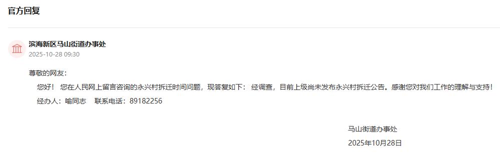 答:经调查,目前上级尚未发布永兴村拆迁公告。感谢您对我们工作的理解与支持!