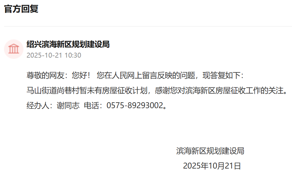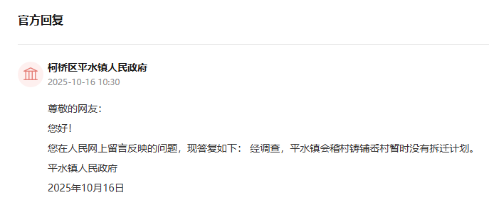问:尊敬的领导,附近有人在议论这边要拆迁,我想问下平水镇会稽村铸铺岙是否有拆迁计划?