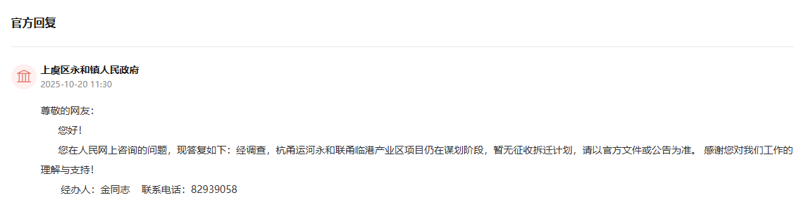 问:经了解,上虞区永和镇三桥村联源码头和新能源船舶项目已经落成,后续500亩的杭甬运河永和联甬临港产业区建设是否会开展?对三桥村征收拆迁何时启动?