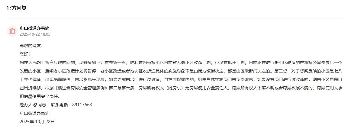 答:首先第一点,胜利东路香桥小区目前暂无老小区改造计划,也没有拆迁计划,目前正在进行老小区改造的东双桥公寓是最后一个改造的小区,后续老小区改造计划将暂停,老小区改造或者地块征收拆迁具体的实施对象不是由属地镇街决定,都是由区级部门决定的。第二点,对于您所反映的小区是七八十年代建造,出现墙面脱落、内部裂痕等现象,如果之前由部门进行过改造,且在质保期内的,则由具体实施部门来负责维修,如果没有部门进行过改造的,则由小区居民自己出资维修。根据《浙江省房屋安全管理条例》第二章第六条,房屋所有权人(既房东)为房屋使用安全责任人,房屋所有权人下落不明或者房屋权属不清的,房屋使用人承担房屋使用安全责任。