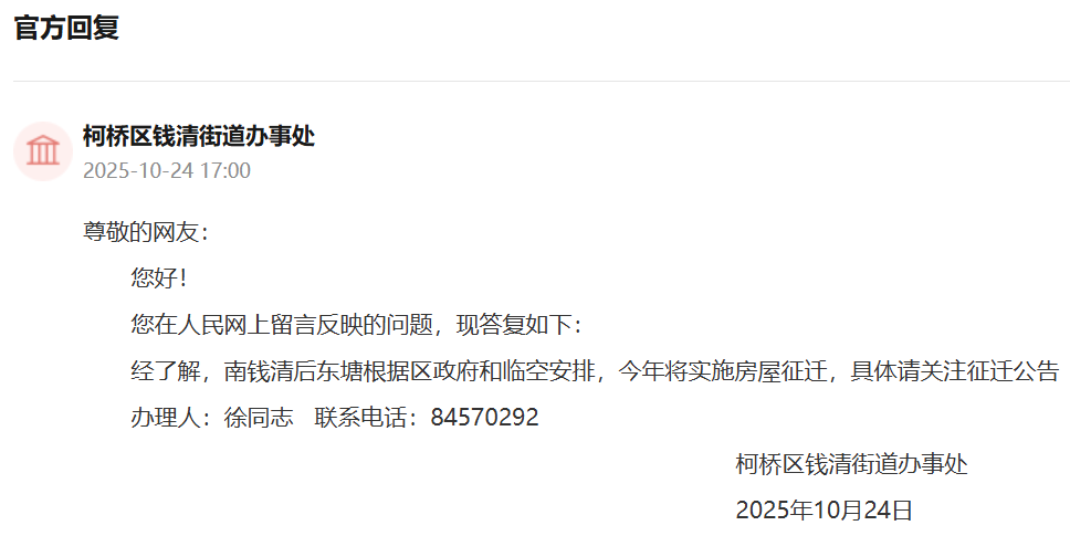 问:领导您好,关于钱清街道后东塘村拆迁,近期有回复中提到,将在今年实施房屋征迁,请问后续具体几月份开始正式启动?