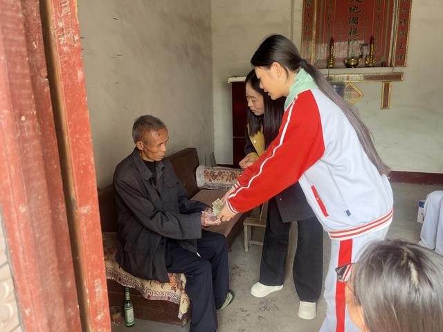 老人身有残疾,曾凭坚韧撑起家庭,却痛失独子,如今独居陋室,唯有墙上泛黄照片,默默诉说过往悲欢。重阳节当天,学校德育处领导与老师带领青年团员,将精心准备的爱心善款与生活物资,郑重交到老人手中。离别前,两名学生悄悄向老师借了100元,轻轻压在老人茶杯下。