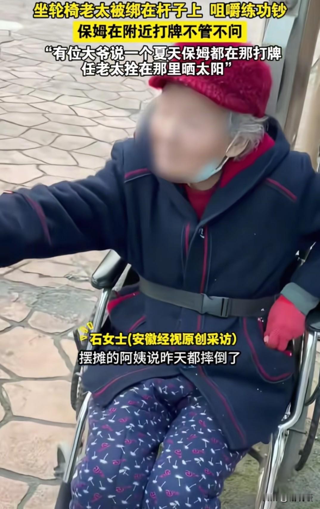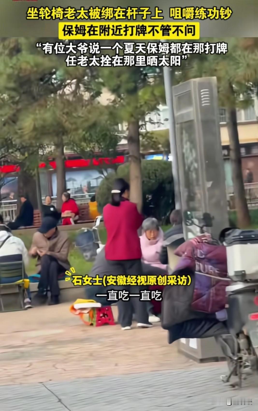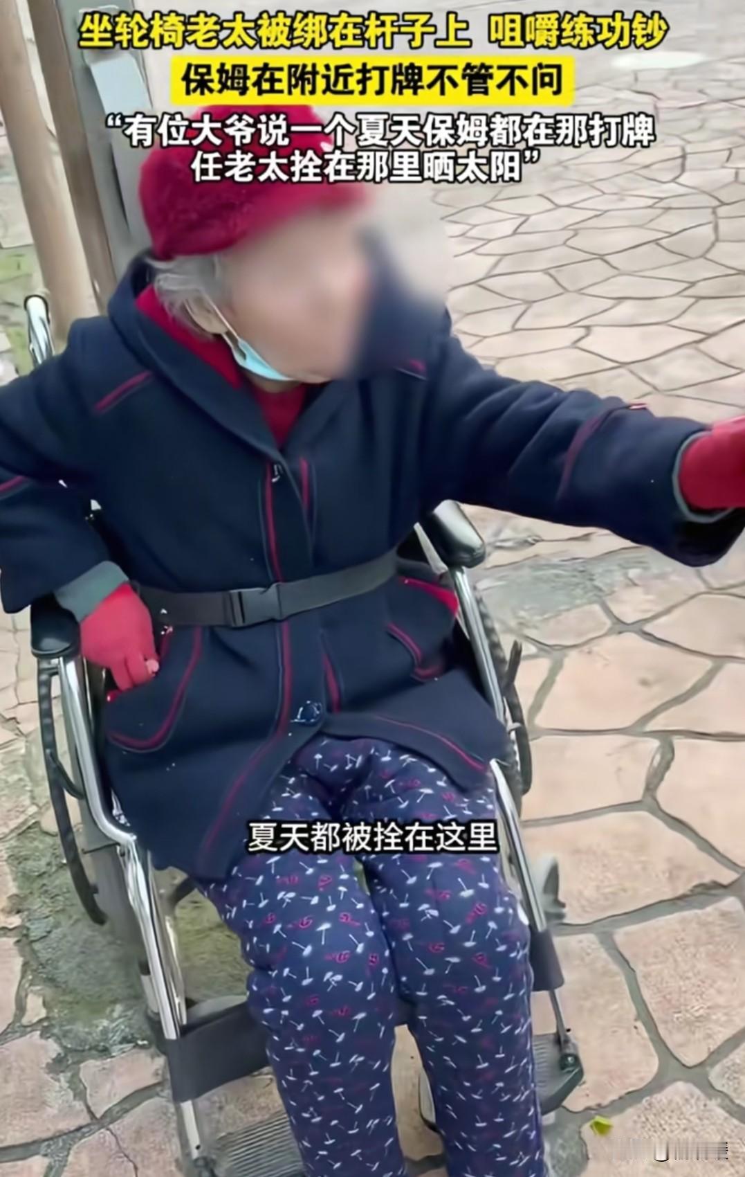 山西长治,一位坐轮椅的老太太被拴在杆子上吃练功钞,负责照顾她的保姆却跑去附近打牌。附近的大爷:不光是现在,整个夏天,几乎天天都能看见老太太被拴在这里晒一下午太阳。 老太太失去了自理能力,她的孩子要忙着赚钱养家,根本没有时间照顾她,于是请了一个保姆。 老太太的孩子在家时,这个保姆对老太太可好了,可当老太太的孩子一上班,保姆就露出原形了。 她平时喜欢打牌,只要老太太的孩子没在家,她就假意推老太太出去呼吸新鲜空气,实际是去公园附近打牌。 到了公园后,她把老太太拴在杆子上,像对待一只动物一样,哪怕是六七月太阳正是毒辣的时候,她对老太太也不管不顾,让老太太晒一下午太阳,她却只忙着打牌。 据附近一位摆摊的阿姨说,前两天老太太摔倒在地上了,有人去通知打牌的保姆,保姆像没听见似的,根本不理会。 有一位网友如今通过手机拍到,老太太被拴在杆子上,从兜里掏出练功钞在吃。 这个保姆实在是可恶,人家花钱请你来是照顾老人的,不是让你来当大爷的,更何况你自己也有父母,换位思考,别人这样对你的父母,你乐意吗? 保姆虐待老人事件,已经不止这一起了,根本原因在于这个行业的就业门槛太低了,应该提高就业门槛,不能光有证就行,还要定期对从业人员进行培训,并考试,不合格直接踢出去。 除此之外,政府应该对从业人员建立信用档案,对于有不良记录的,直接把其拉入该行业黑名单,禁止其再就业。