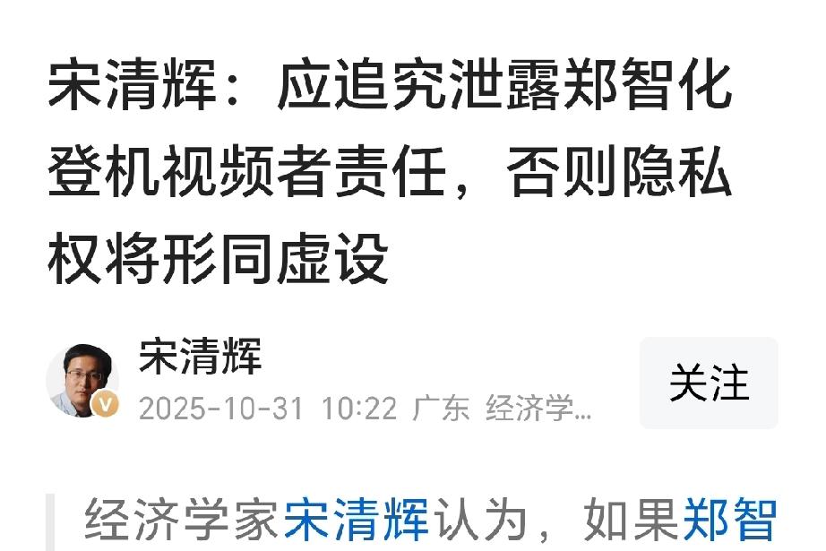 宋清辉说:请追究泄露郑智化登机视频者责任,否则隐私权将形同虚设!请问,您支持他的观点?还是反对他的观点? 郑智化属于公众人物吧?当公众人物出现公共事件之时,他的隐私权还应该继续隐私吗? 如果还继续隐私,公众何以了解真相?难道让他的污蔑就按照他的说辞持续下去吗? 如果,视频是在他出事前公布还属于泄露隐私的话,那么,出事后公布就属于拿出证据了!公众有了解事情真相的权利!大家觉得呢? 那么,到底该不该追究泄露郑智化登机视频者的责任呢?请公正的网友在评论区留言!