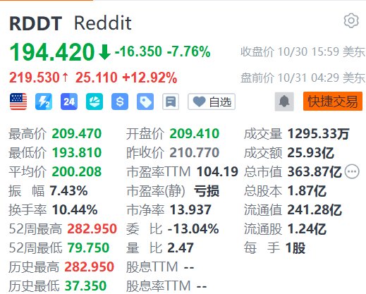 格隆汇10月31日|Reddit(RDDT.US)盘前大涨近13%,报219.5美元。消息面上,公司周四公布的第三季度财报远超所有预期。营收同比增长68%至5.85亿美元,每股收益达0.8美元,远超0.51美元的目标。净利润为1.63亿美元,高于去年同期的1.33亿美元,增幅达23%。
