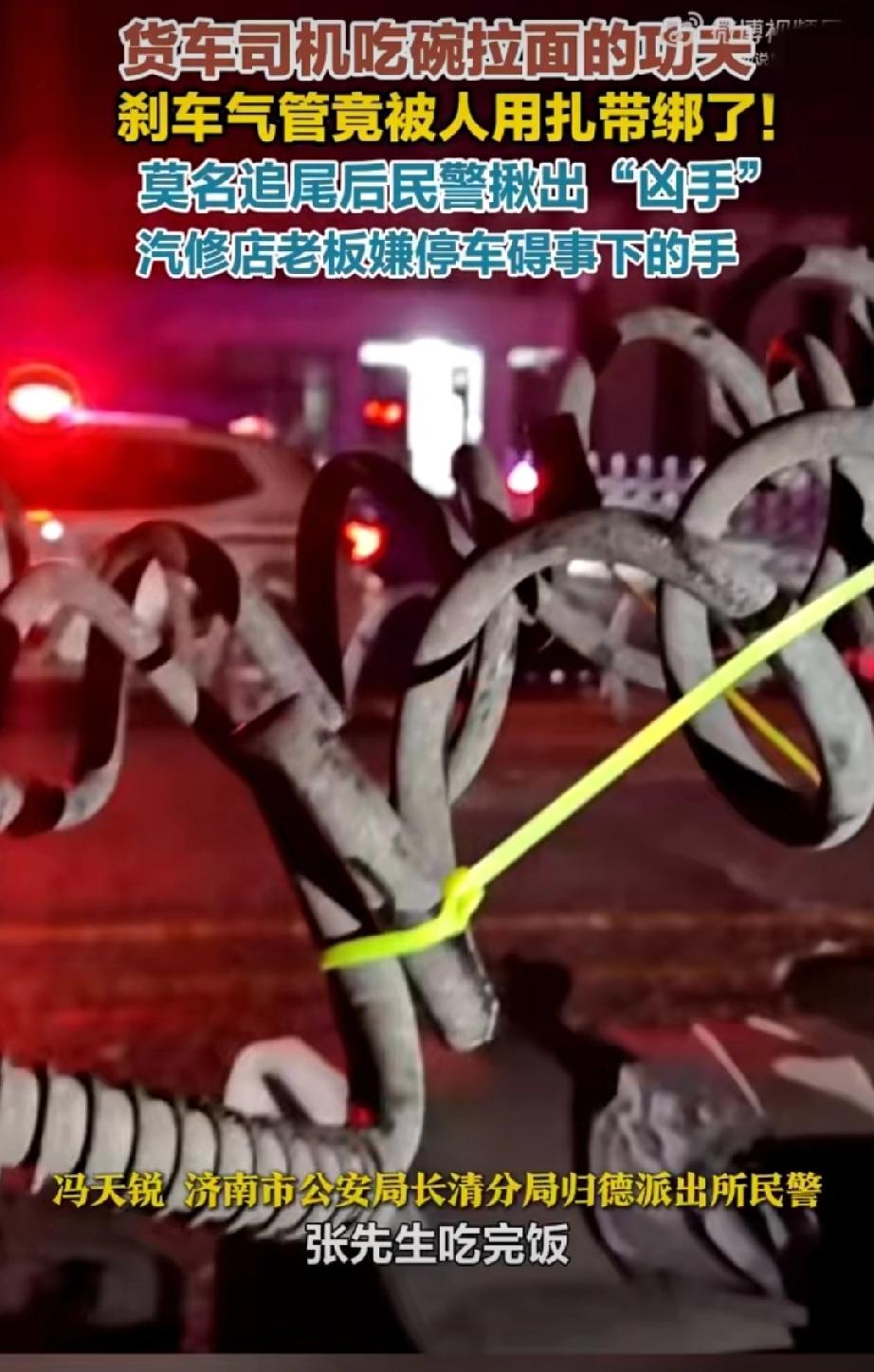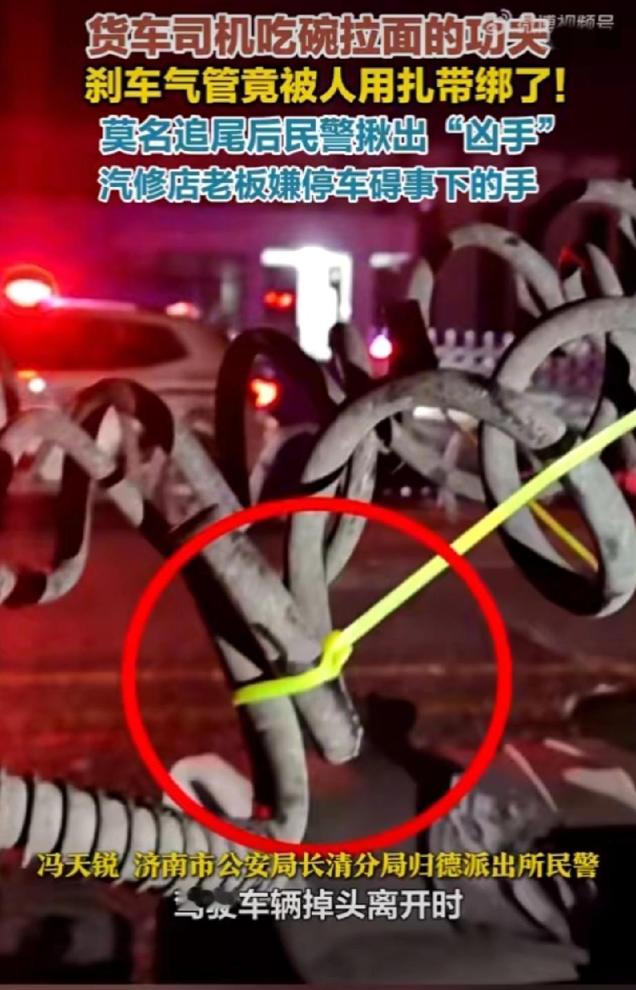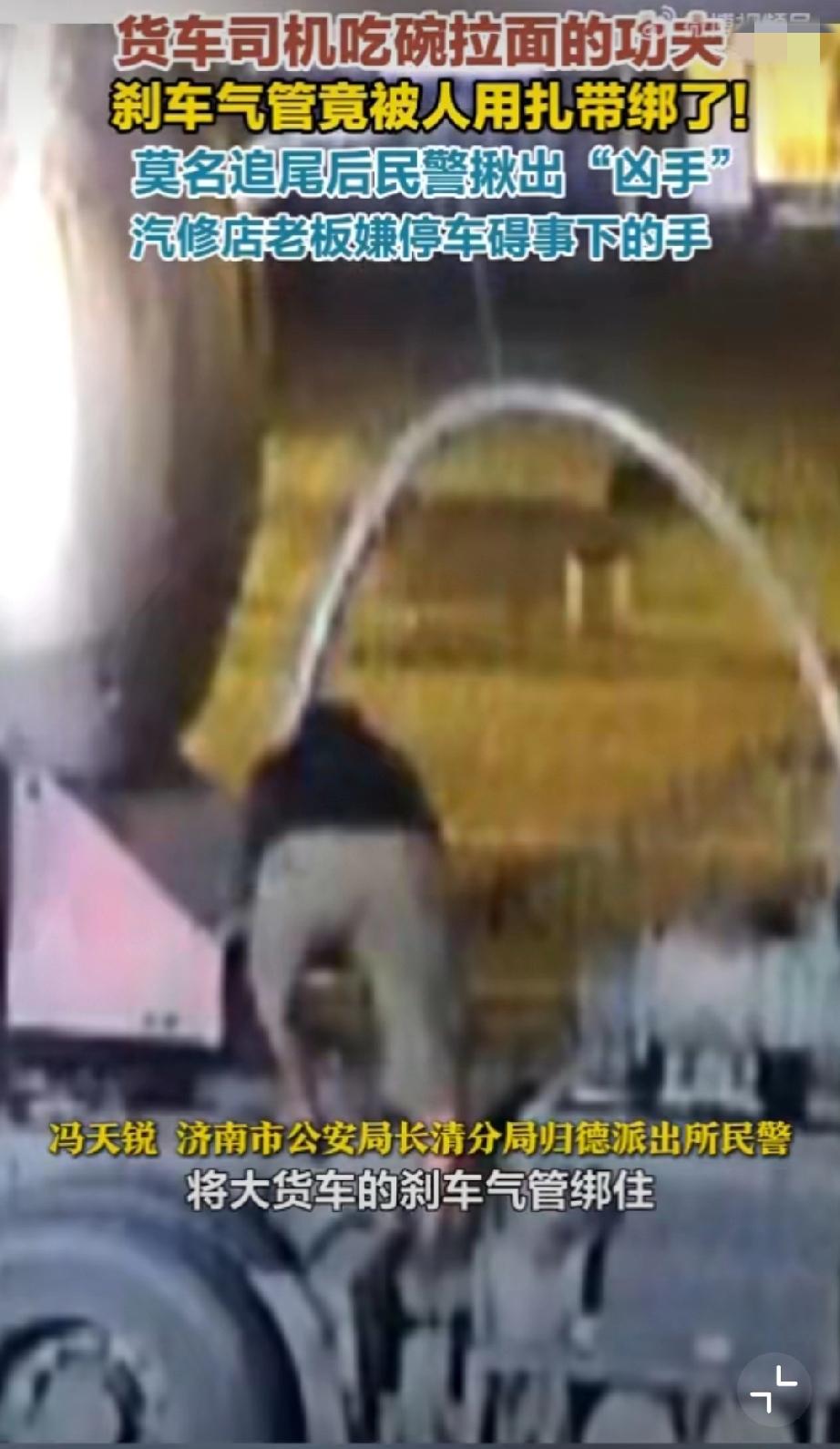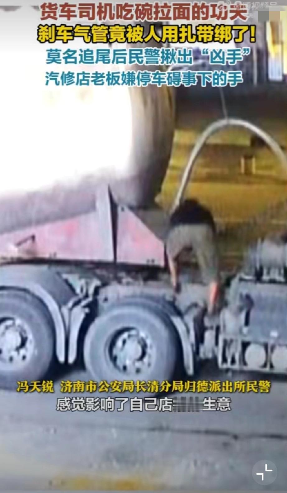 因嫌挡了生意汽修店老板将大货车刹车破坏酿成事故。近日济南货车司机吃碗拉面的功夫刹车气管竟被人用扎带绑了!莫名追尾后民警揪出“凶手”汽修店老板嫌停车碍事下的手。(来源:山东电视新闻频道)。目前汽修店老板被以破坏交通工具罪刑事拘留。货车交通事故 大货车事故 山东交通事故