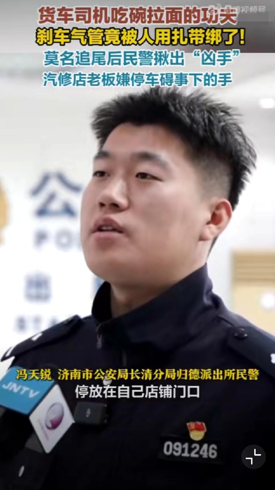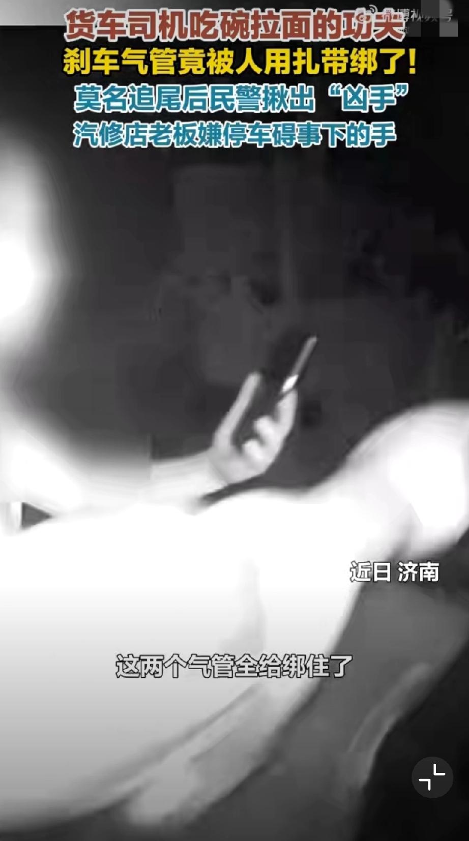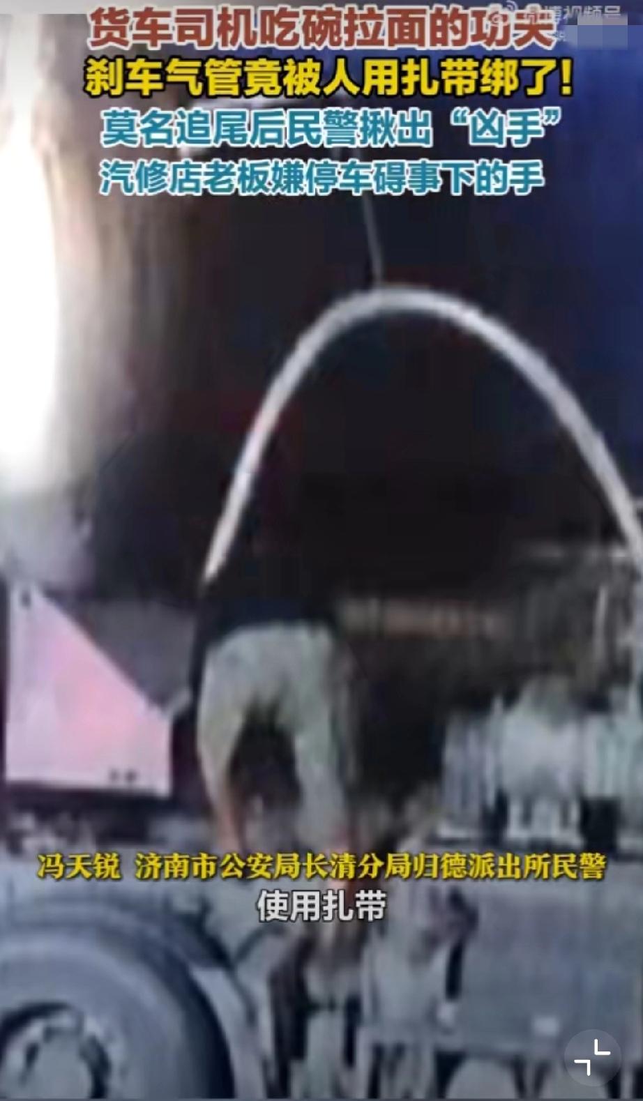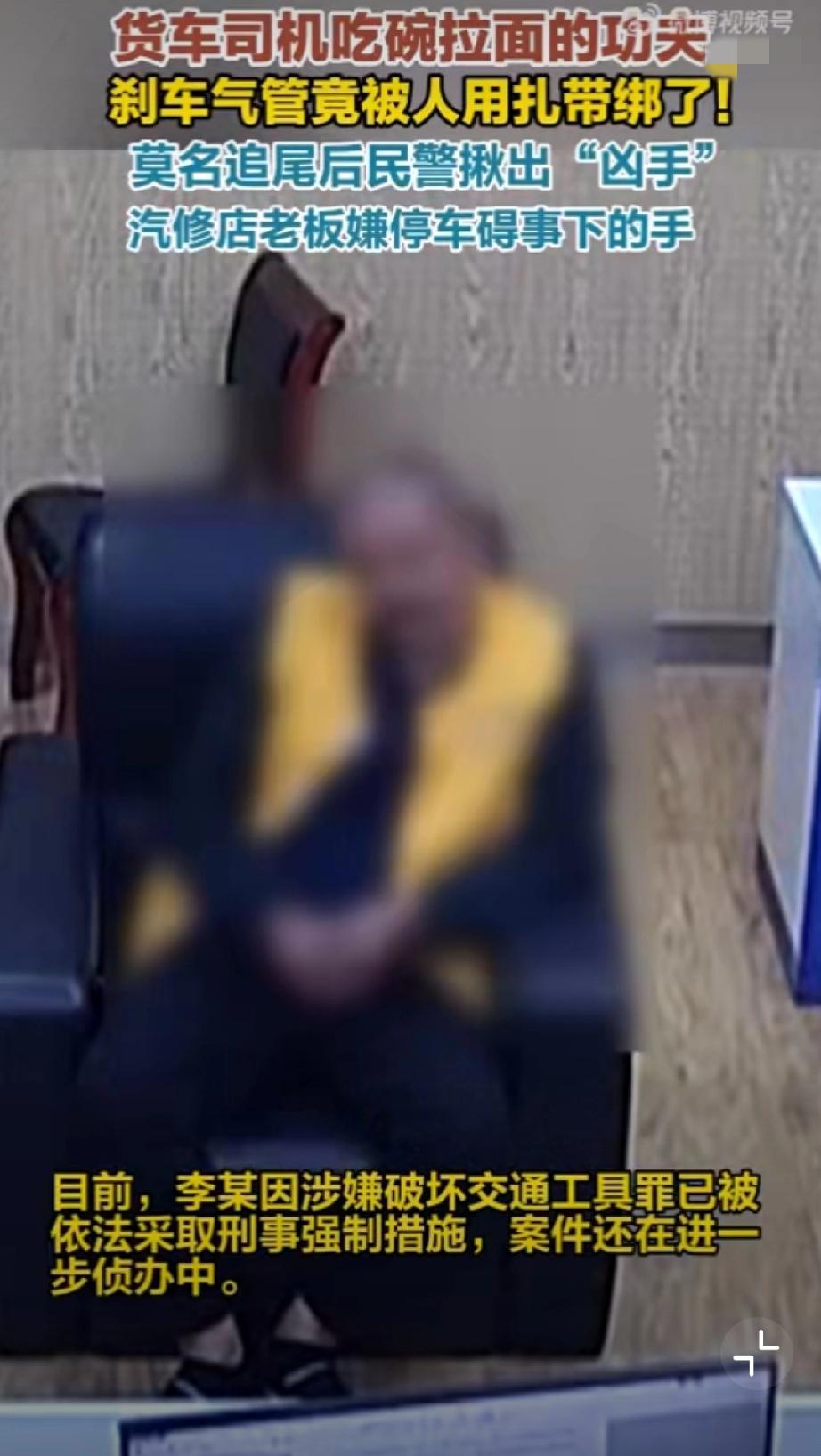 因嫌挡了生意汽修店老板将大货车刹车破坏酿成事故。近日济南货车司机吃碗拉面的功夫刹车气管竟被人用扎带绑了!莫名追尾后民警揪出“凶手”汽修店老板嫌停车碍事下的手。(来源:山东电视新闻频道)。目前汽修店老板被以破坏交通工具罪刑事拘留。货车交通事故 大货车事故 山东交通事故