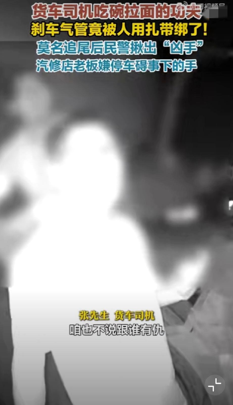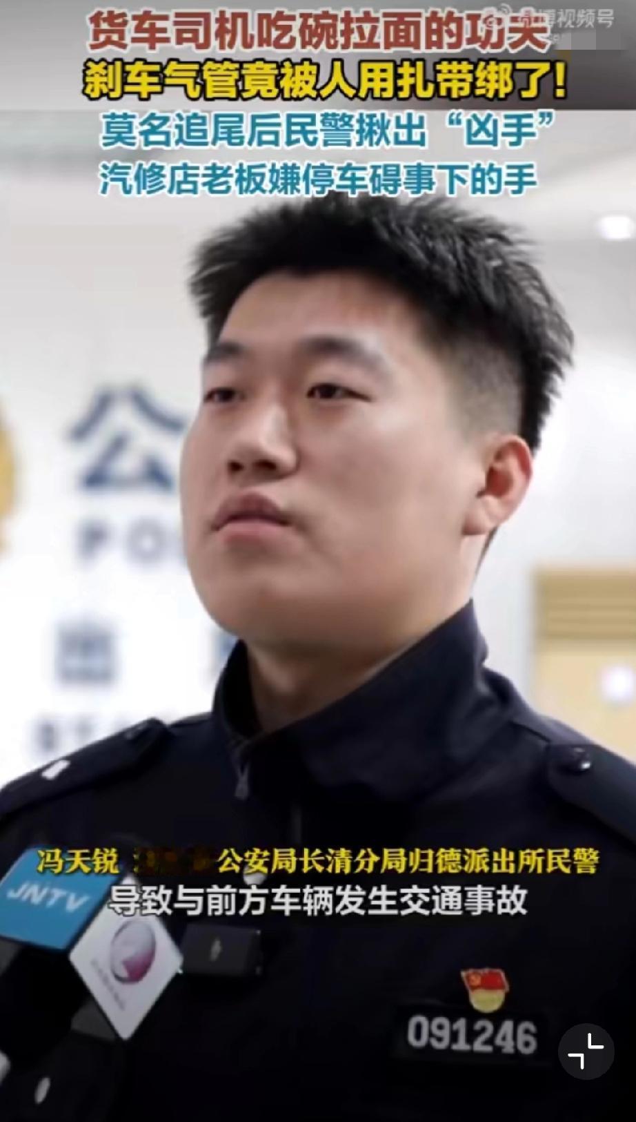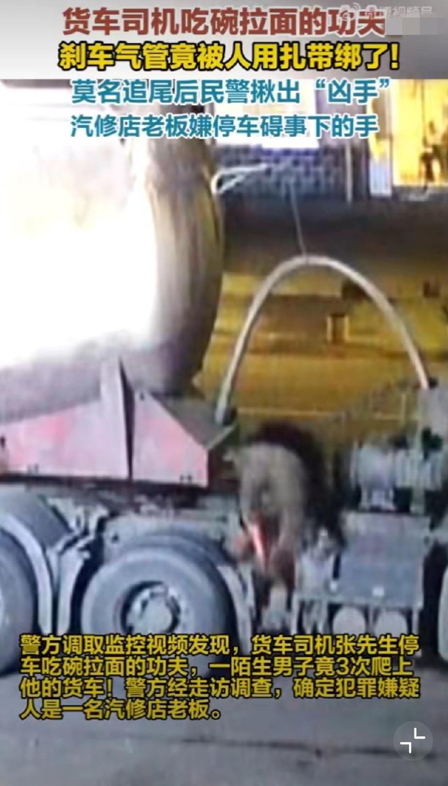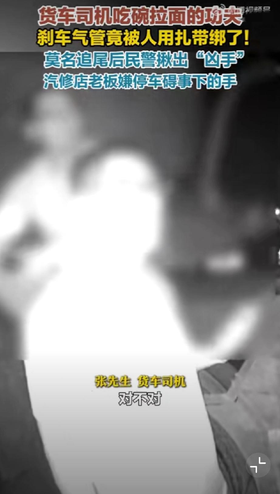 因嫌挡了生意汽修店老板将大货车刹车破坏酿成事故。近日济南货车司机吃碗拉面的功夫刹车气管竟被人用扎带绑了!莫名追尾后民警揪出“凶手”汽修店老板嫌停车碍事下的手。(来源:山东电视新闻频道)。目前汽修店老板被以破坏交通工具罪刑事拘留。货车交通事故 大货车事故 山东交通事故