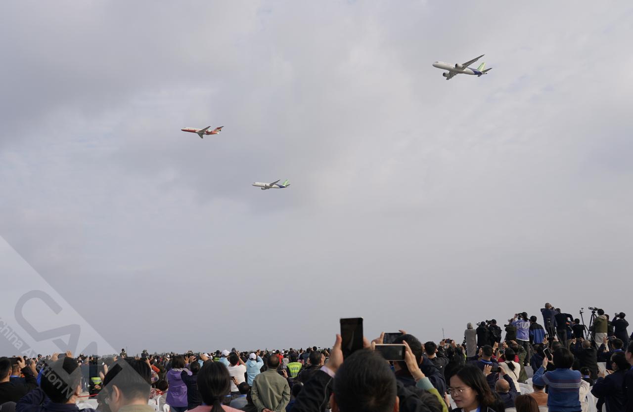 10月31日,2025南昌飞行大会暨航空产业博览会开幕,中国商飞两架C919和一架C909进行飞行演示。(岳书华)