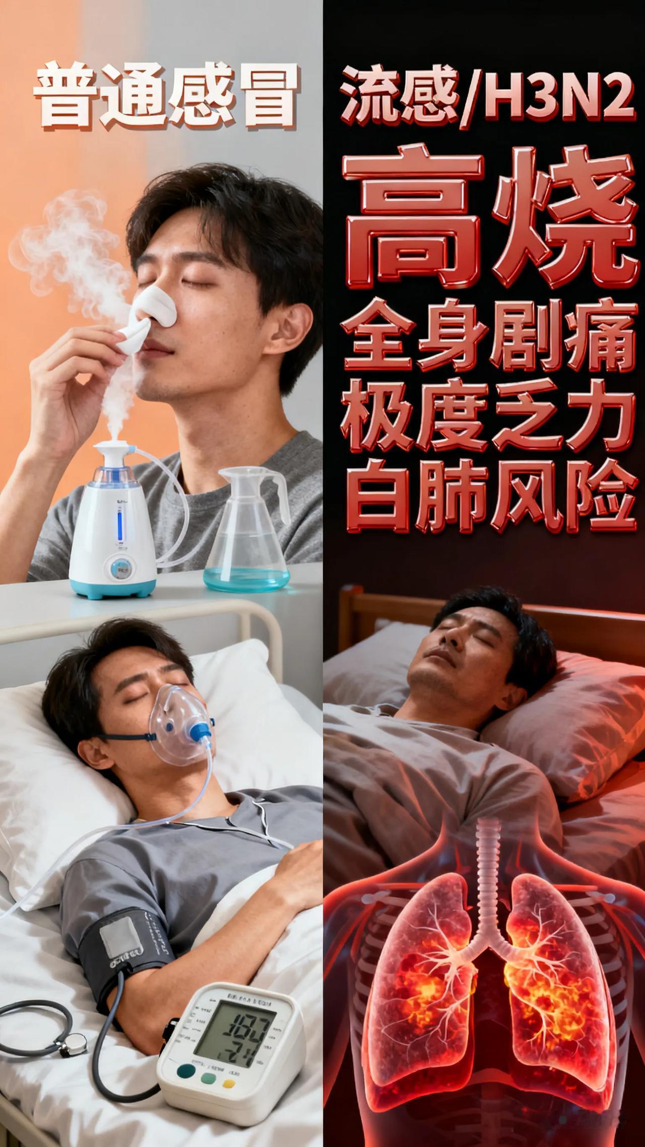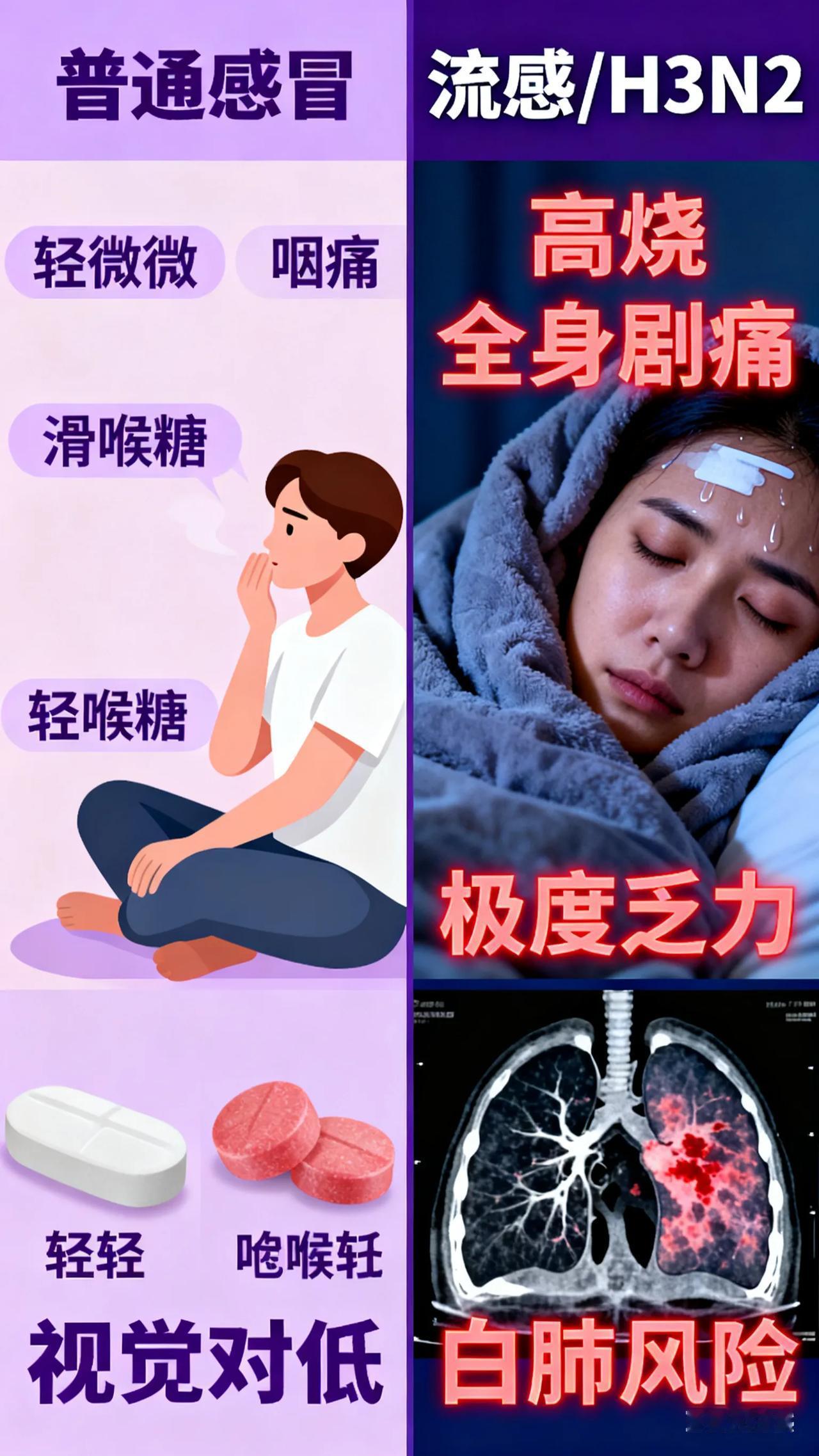 警惕!新毒株H3N2来势汹汹,有人硬扛3天成“白肺”,这些症状别当普通感冒 千万别把发烧咳嗽不当回事!今年主流流感毒株已换挡成H3N2,传染性更强、传播更快。有人因硬扛几天,肺部竟大面积变白,令人心惊! 最新监测数据显示,甲型H3N2毒株已取代H1N1,成为当前流感病毒的“主角”。由于公众对其免疫力较低,今年感染人数可能显著增加。 这并非新面孔,而是1968年就曾引发“香港流感”的老对手。它典型症状包括突发高烧(常超39℃)、喉咙剧痛、咳嗽及全身肌肉关节酸痛,与普通感冒截然不同——流感全身症状重,乏力感能让你下不了床。 真实案例触目惊心:杭州39岁的程女士,确诊后自觉身体好拒绝住院,硬扛3天后检查,多个肺叶出现“白肺”,教训惨痛! 提醒您:一旦出现突发高热、肌肉酸痛等典型症状,务必及时就医,切勿自行用药硬扛。勤洗手、多通风、接种疫苗仍是有效防护手段。转发提醒身边人,这个流感季,我们一起科学防范! 新型流感 h3n2毒株 T病毒 新病毒咳嗽