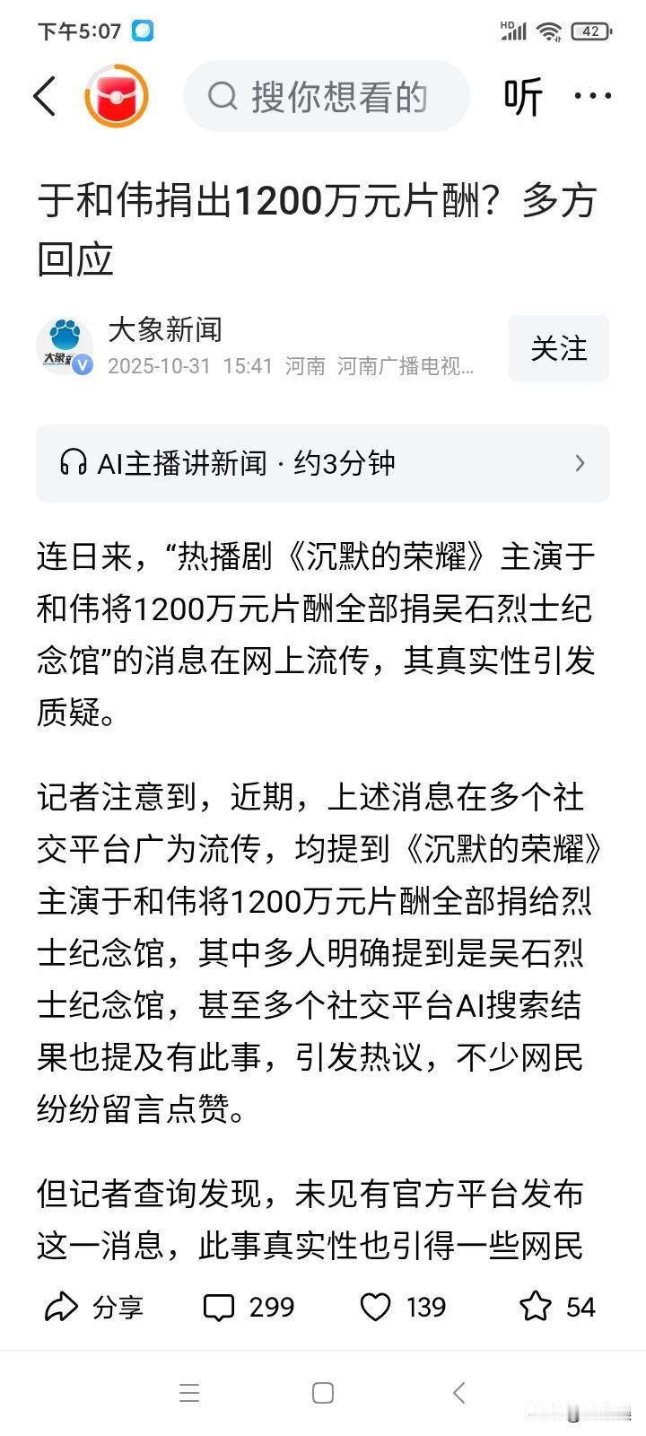 演员于和伟,捐出1200万元片酬?回应来了。 近日,于和伟上了热搜,不是因主演《沉默的荣耀》中的吴石,而是因网传他捐出该剧所获得的1200元片酬给吴石烈士纪念馆。 10月30日,有记者向吴石的家乡政府求证此事,得到的答复是未听说过此事和没有这回事! 网友看完,评论说,于和伟是一名演员,他尽心尽力演好吴石就行了,至于捐不捐出这部剧的片酬是于和伟个人的决定,因为那是他辛勤的劳动所得,没必要道德绑架。