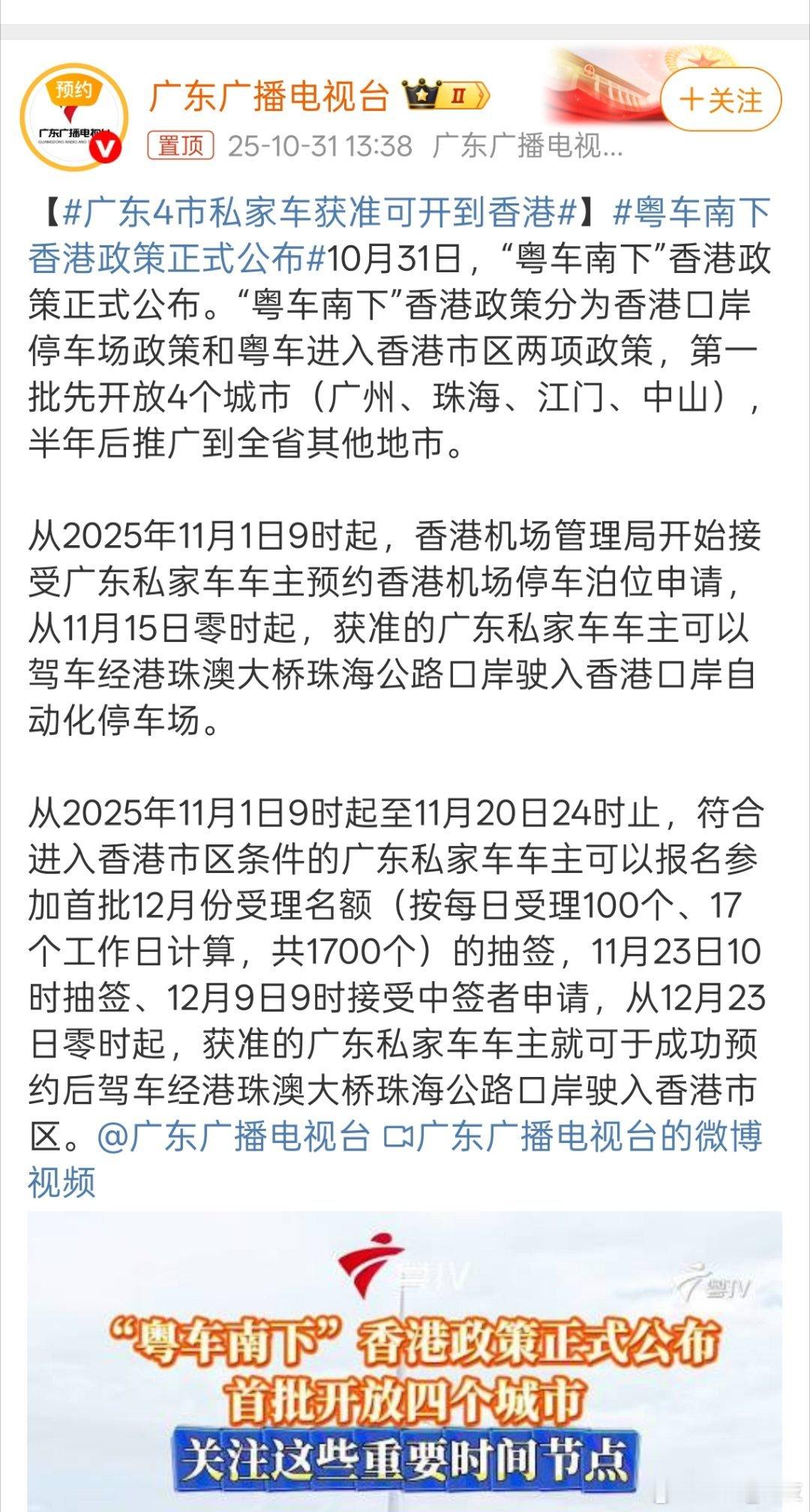 “粤车南下”香港政策正式公布。第一批先开放4个城市(广州、珠海、江门、中山),半年后推广到全省其他地市。