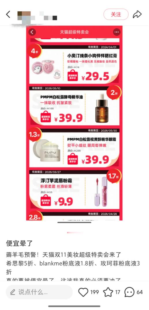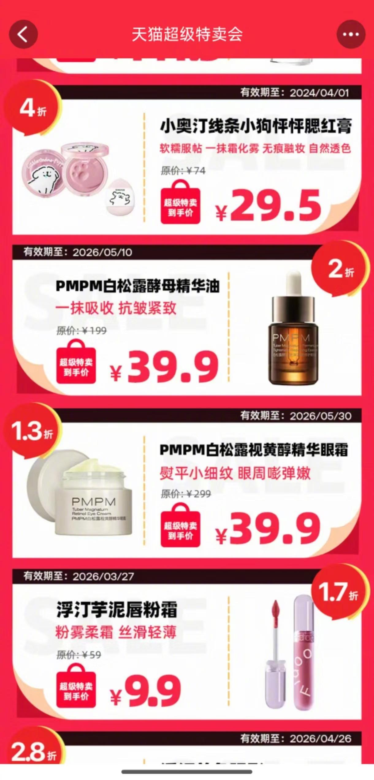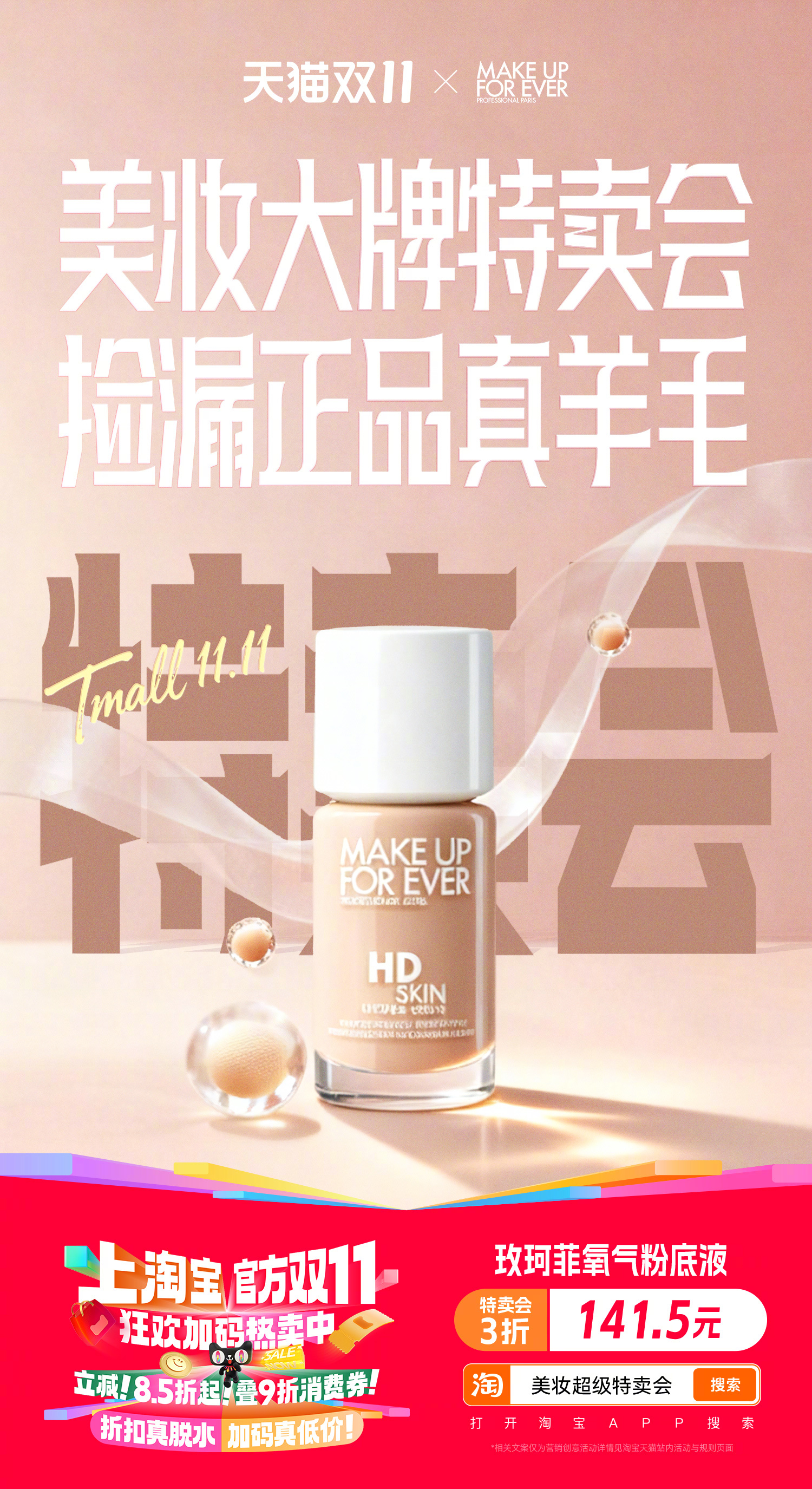 【天猫双11美妆大牌特卖2折抢】天猫双11美妆迎来重磅让利,玫珂菲MakeUpForEver粉底液、PMPM眼霜等多款热门单品折扣降至2折,创下历史新低,此次天猫双11大牌特卖会活动为消费者再一次提供了薅羊毛入手时机。打开淘宝搜索「美妆超级特卖会」,消费者就可以选择购入心仪低价产品。