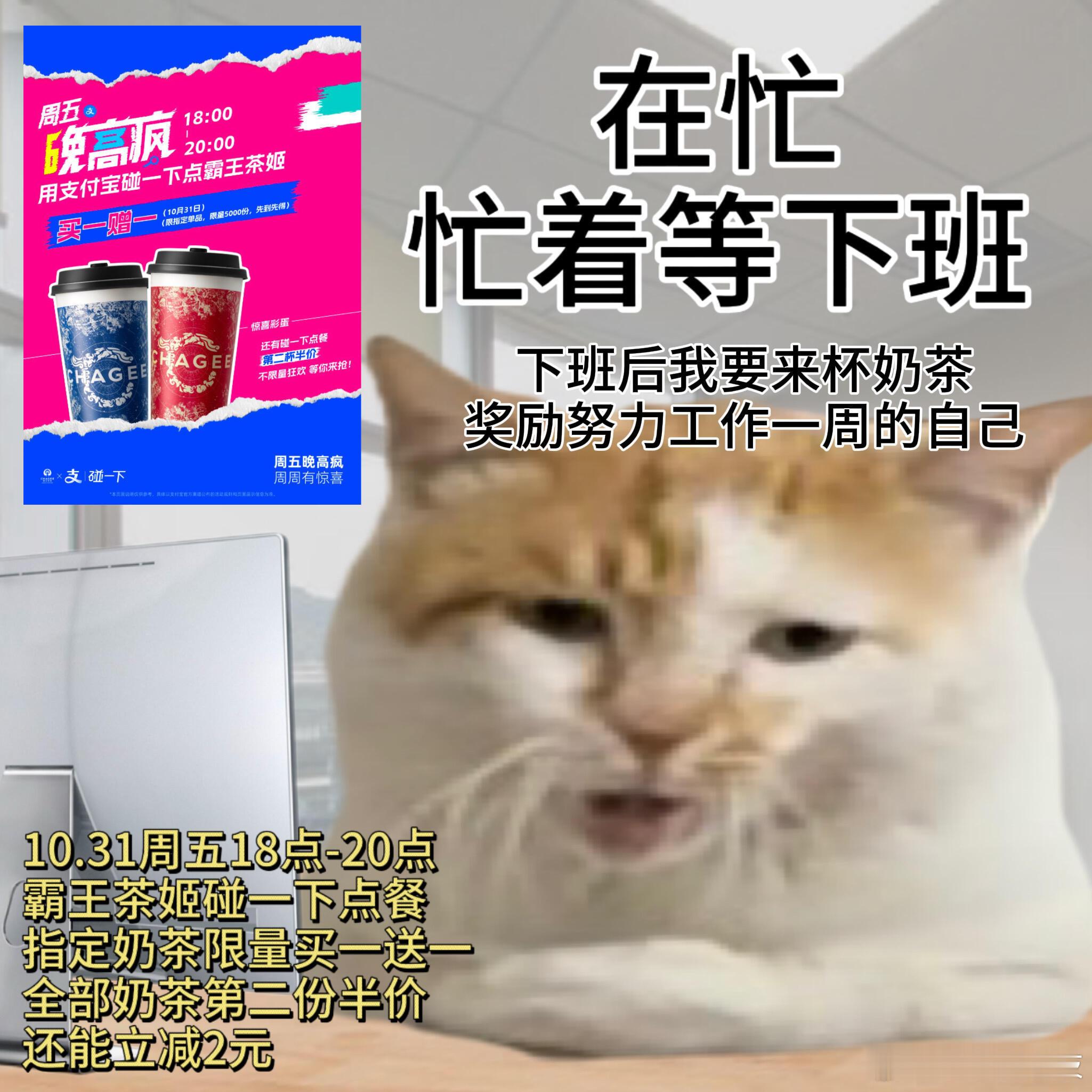 周五下午五点,我的灵魂已经开始放假了,但肉身还困在工位上,一想到待会儿地狱级别的晚高峰就两眼一黑… BUT!家人们我发现一个天大的好事!今晚的晚高峰不一样,支付宝直接把它变成了“晚高疯”!听我的,一小时后(18点-20点),下班直接冲去霸王茶姬,用支付宝“碰一下”结账,说不定直接给你买一送一!这哪是晚高峰,这简直是快乐冲锋号啊!用一杯奶茶钱瞬间治愈一周的疲惫!周五基础支付宝晚高疯就不基础