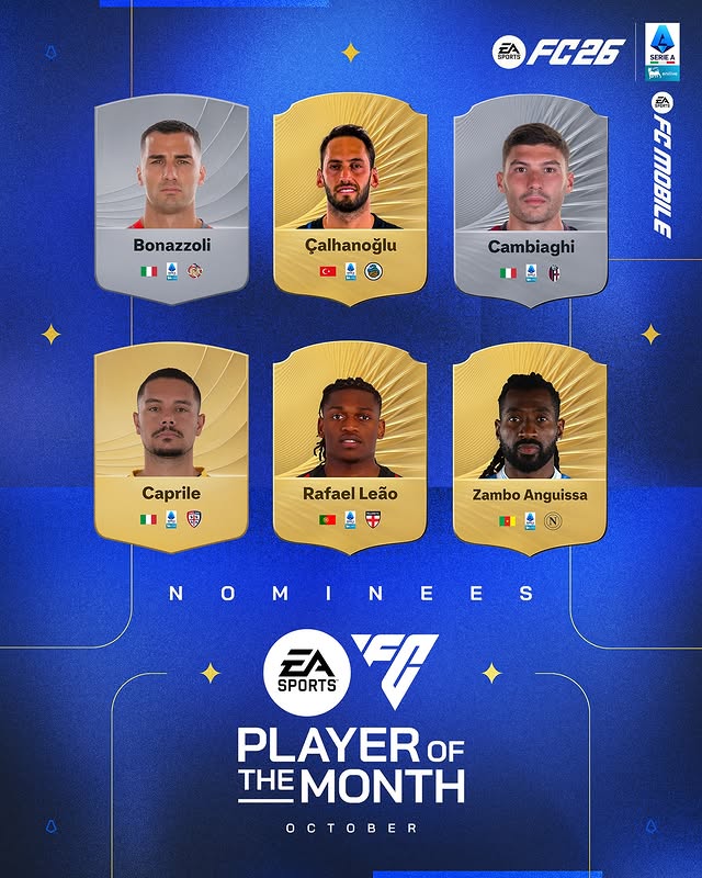 意甲10月份最佳球员候选:莱奥、恰尔汗奥卢、安古伊萨在列