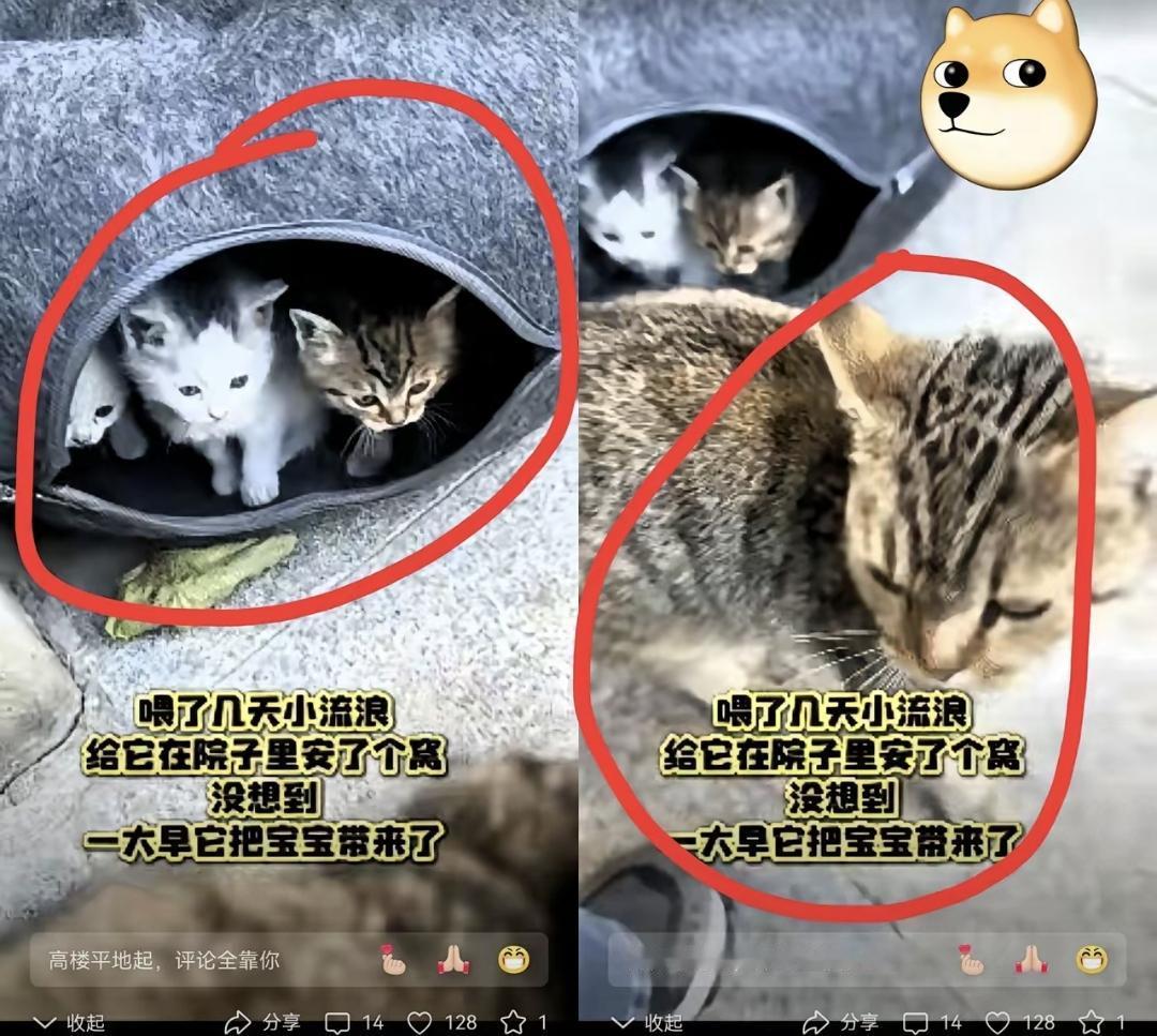 吉林有位大姐自家养猫。这天她在车库发现一只流浪猫,天冷怕它冻着,就买了个猫窝放那。第二天再去,猫窝里全是小猫崽子,母猫在旁边守着。 原来这母猫早就在车库生了三只崽,担心窝里挤不下,自己睡外面。大姐本来不打算收养,但见这情况还是每天来喂猫粮。后来还带小猫去打预防针,到处帮它们找新家。 母猫一开始躲着人,后来慢慢敢靠近了。现在小猫都满月了,大姐还在忙着联系愿意养猫的人家。