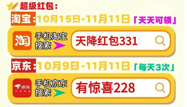 2025年淘宝京东双11活动来啦!在淘宝京东双十一活动时间内,每天领取1次、最高可得11111元京东双11超级红包,京东搜[有惊喜228]京东双11购物国补优惠每天再多领1次红包。直达京东优惠券领取口令,领取要购买商品的京东粉丝福利购优惠券后下单可享受券后价优惠叠加京东双十一活动优惠力度会更大。
