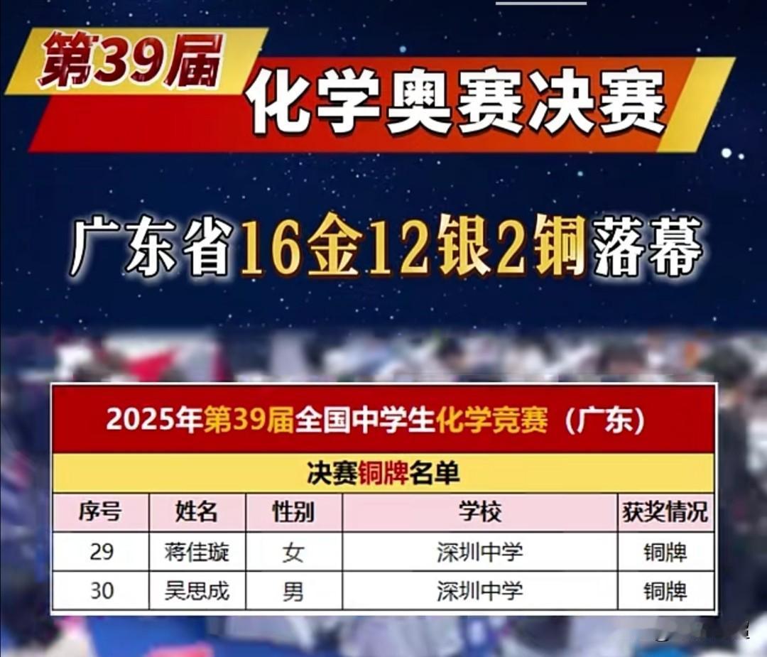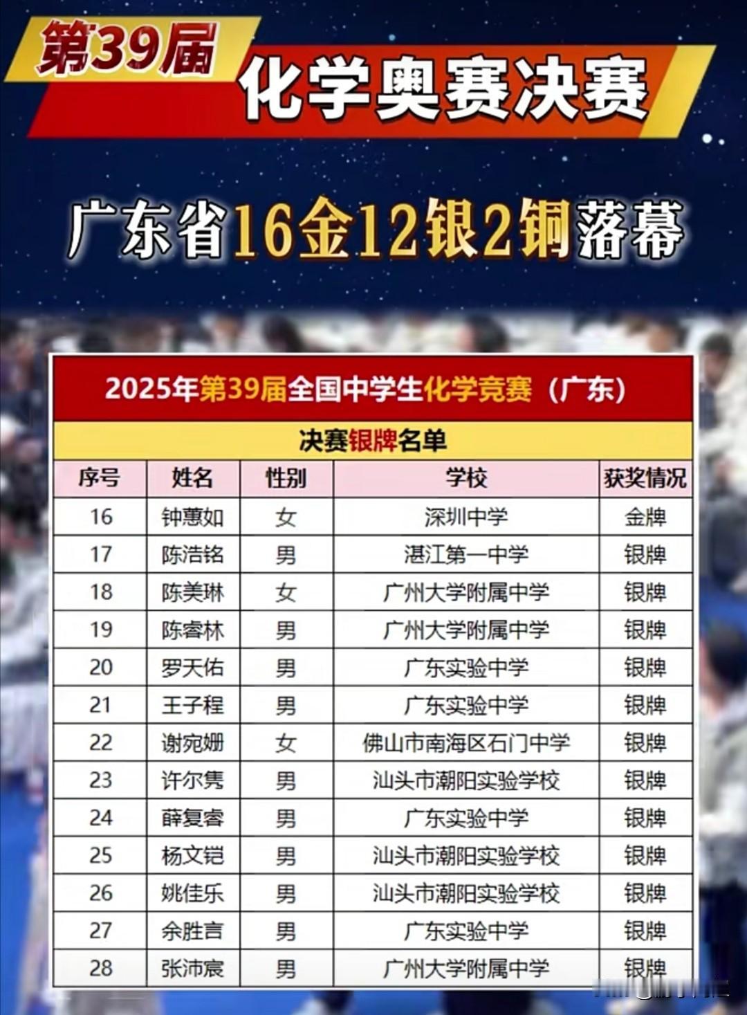 2025年第39届全国化学竞赛(决赛)广东省奖牌名单 在本届化学决赛中,有608位选手参加,将产生208枚金牌、248枚银牌和152枚铜牌。 广东省以16枚金牌、12枚银牌、2枚铜牌,奖牌总数共计30枚,仅次于浙江35枚,位居全国第二位。其中,深圳中学独揽10枚金牌。