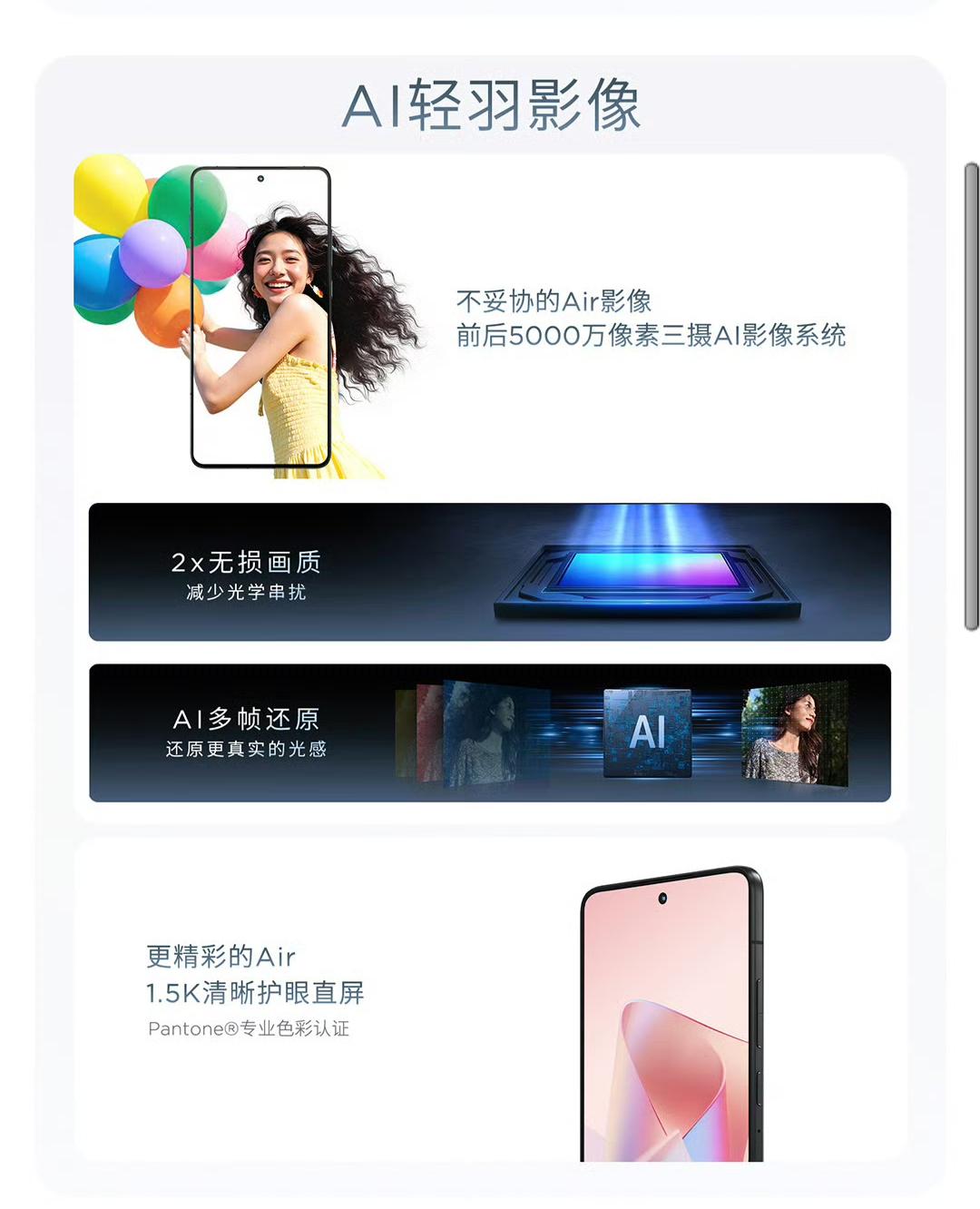 摩托罗拉发布一块厚度只有5.99mm的手机,moto X70 Air发布,2399元起 首发价: 12+256GB:2399元 12+512GB:2699元 核心参数如下: ---骁龙7 Gen4处理器,LPDDR5X,UFS3.1 ---6.7英寸OLED直屏,1.5K分辨率,120Hz刷新率 ---50MP主摄(三星GNJ,1/1.56英寸,OIS)+50MP超广角(JN5),前置50MP ---68W有线+15W无线充电+4800mAh电池,厚5.99mm、重159g ---支持NFC,不支持红外遥控,0809 X轴马达,IP68&IP69,双频GPS+三频北斗,双扬声器 外观看着还行,外围配置也不算差,而且这块机型可参加国补,其实起步价也就1900多,512GB也才2100多,喜欢轻薄的朋友确实可以考虑一下。