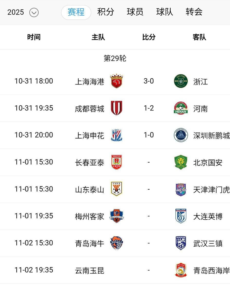 面对无欲无求的河南队,蓉城1-2输球彻底丧失夺冠机会。 申花1-0险胜深圳新鹏城,距离海港依然是2分的差距。 海港3-0大胜浙江队,夺冠路上虽然掌握主动权,但末轮1分不足以夺冠,除非申花不胜。 末轮只要申花赢球,海港想要夺冠也必须赢球。最后一轮,海港客场打大连英博,申花客场打天津。