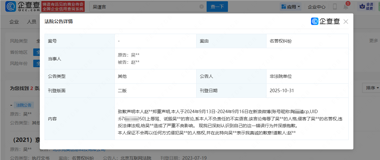 企查查APP显示,10月31日,法院刊登赵某某致歉声明。公告显示,赵某称其在涉案账号上辱骂、诋毁吴谨言的言论,系其不负责任的不实语言,该言论侮辱了吴谨言的人格,侵害了名誉权。赵某表示,保证不会再以任何方式侵犯吴谨言的人格权,并真诚的道歉。