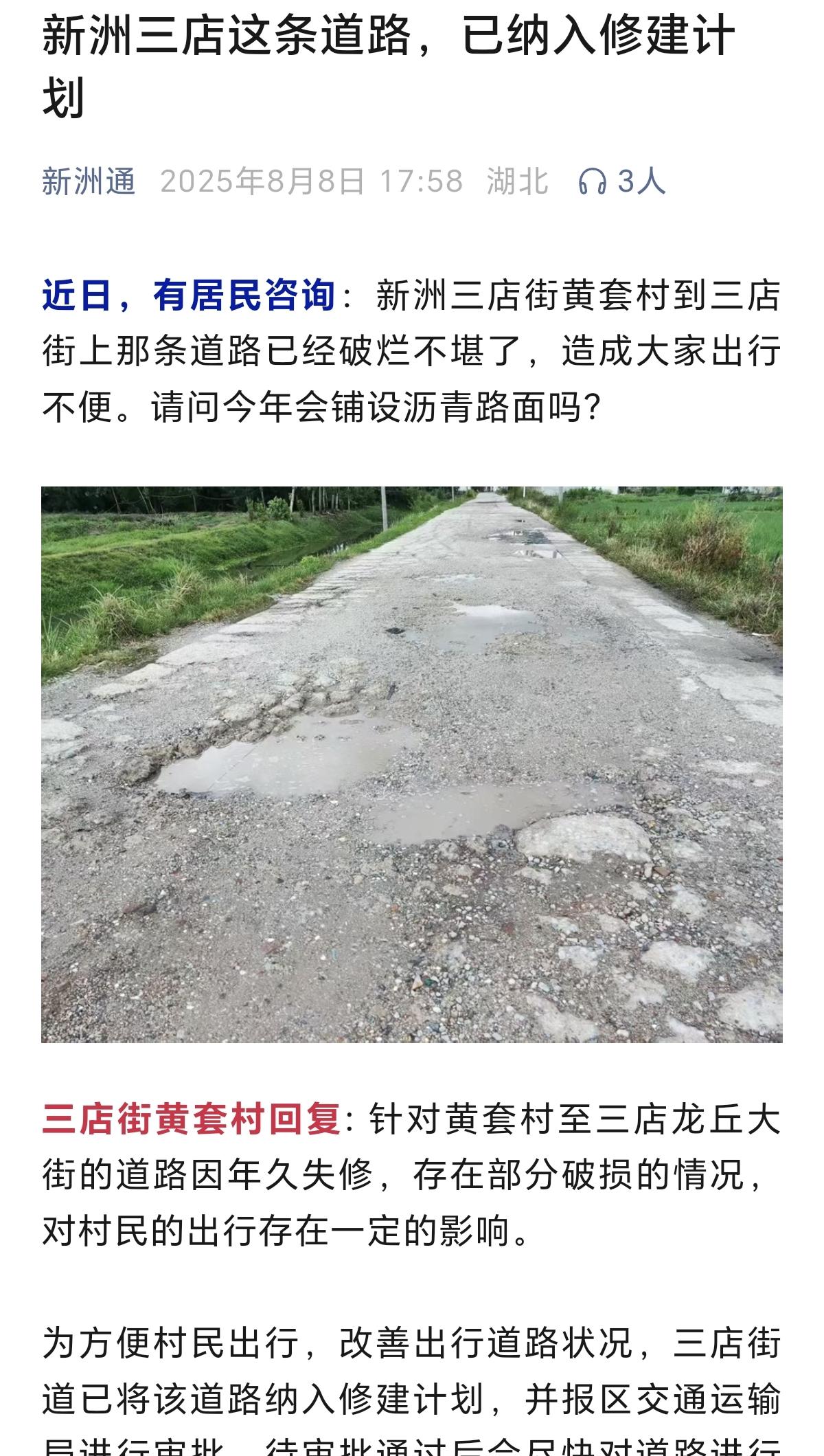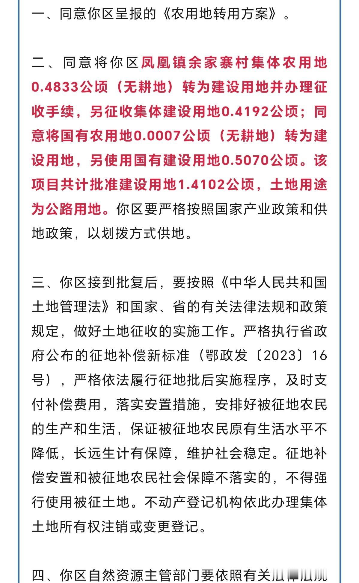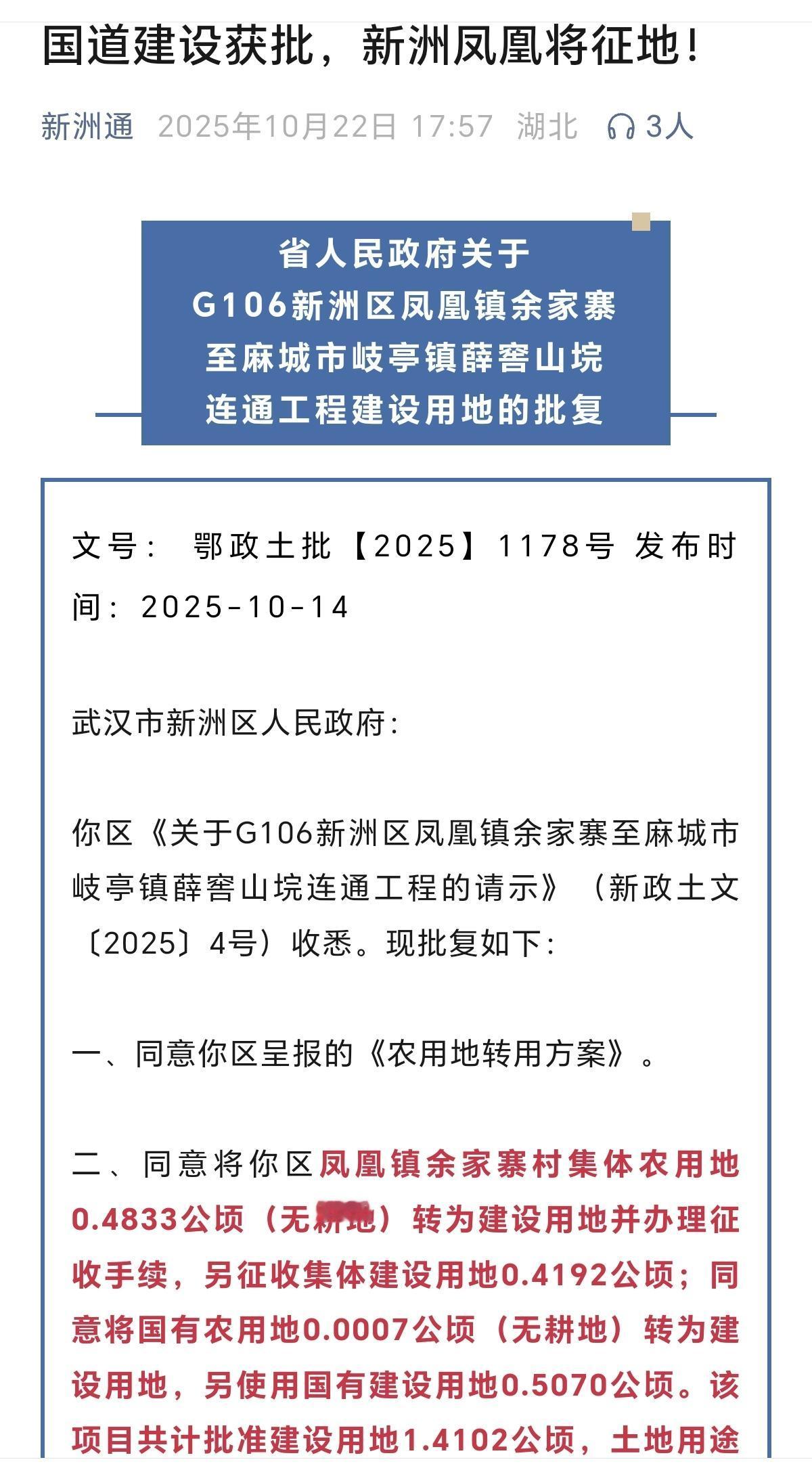 武汉新洲北大门的道路运输压力巨大! 新洲区三店街黄套村回复: 针对黄套村至三店龙丘大街的道路因年久失修,存在部分破损的情况,对村民的出行存在一定的影响。 为方便村民出行,改善出行道路状况,三店街道已将该道路纳入修建计划,并报区交通运输局进行审批,待审批通过后会尽快对道路进行维修处理。 新洲区凤凰余家山村至胜利小学道路原为3米宽度水泥路,全长2.5公里左右即将拓宽! 新洲区《关于G106新洲区凤凰镇余家寨至麻城市岐亭镇薛窖山垸连通工程的请示》(新政土文〔2025〕4号)收悉。现批复如下: 一、同意你区呈报的《农用地转用方案》 文号: 鄂政土批【2025】1178号 湖北省人民政府 2025年9月25日 湖北新洲 新洲交通省界限高架 国道限宽墩 新洲去麻城歧亭的这段烂路什么时候能修一下,都好几年了,路上灰尘弥漫,坑坑洼洼。"实地拍摄 湖北麻城