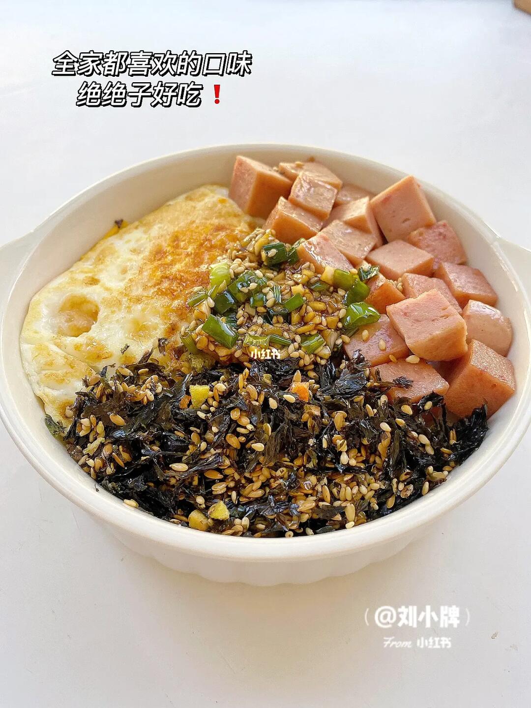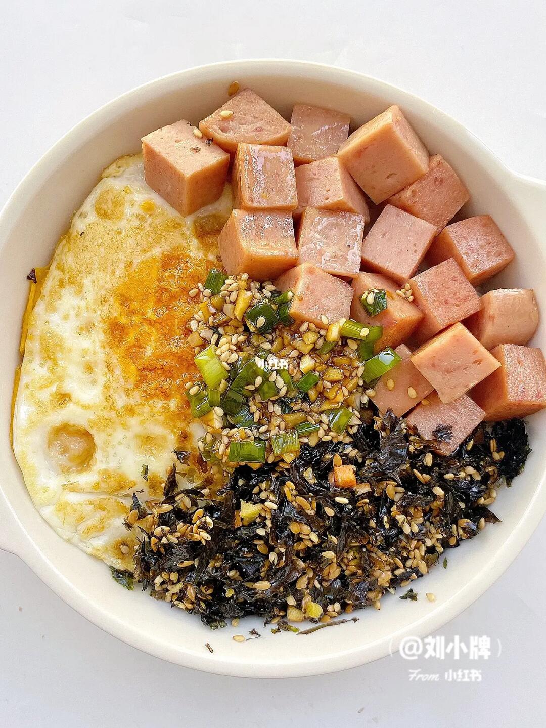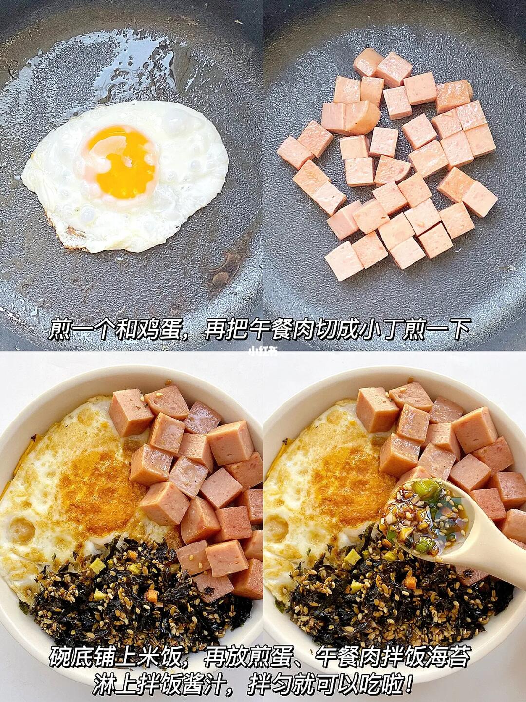 3⃣️米饭铺在碗底,鸡蛋海苔碎和午餐肉摆在米饭上,淋上拌饭酱汁,拌匀就可以开吃啦‼️