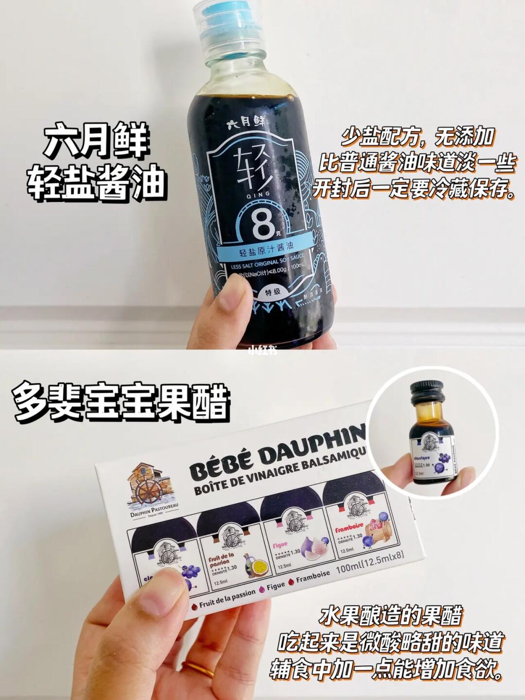 ✅六月鲜轻盐酱油:含盐量低,味道比大人的酱油要淡。保质期短,需要冰箱冷藏。