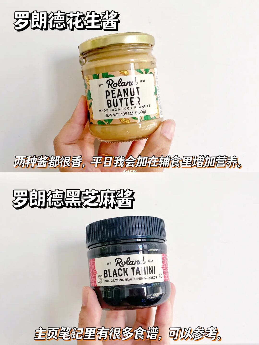 ✅罗朗德花生酱、黑芝麻酱:黑芝麻酱含钙、铁等营养,适合6m+的宝宝,花生酱适8m+的,研磨细腻。两款的配料表都干净,没有添加,吃起来香香的,我经常会用来搭配辅食。