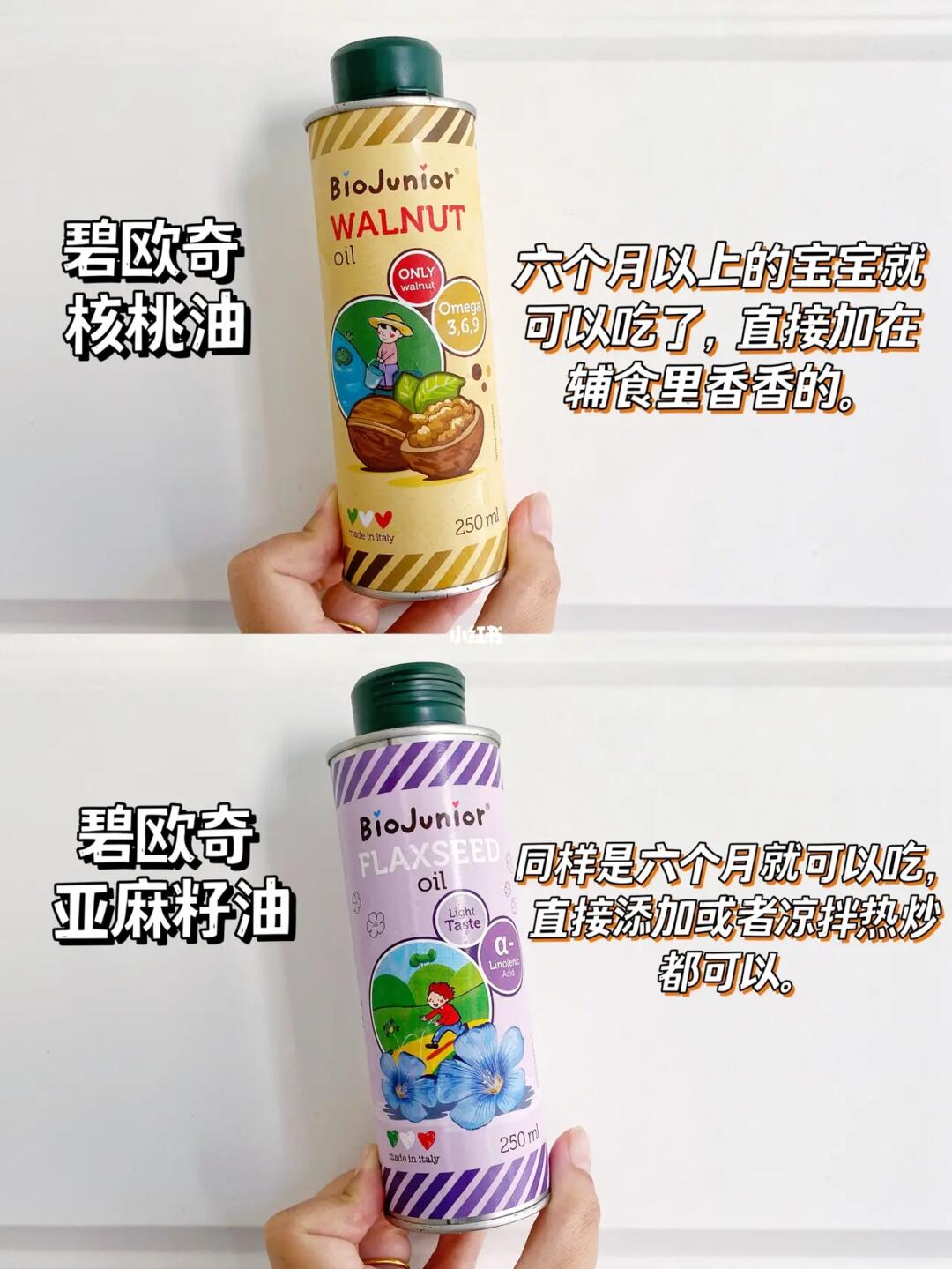 ✅碧欧奇核桃油、亚麻籽油:六个月以上宝宝就可以添加了,核桃油直接滴在辅食里,亚麻籽油可以用来凉拌或者热炒。也是从小到大不知道吃了多少瓶啦。