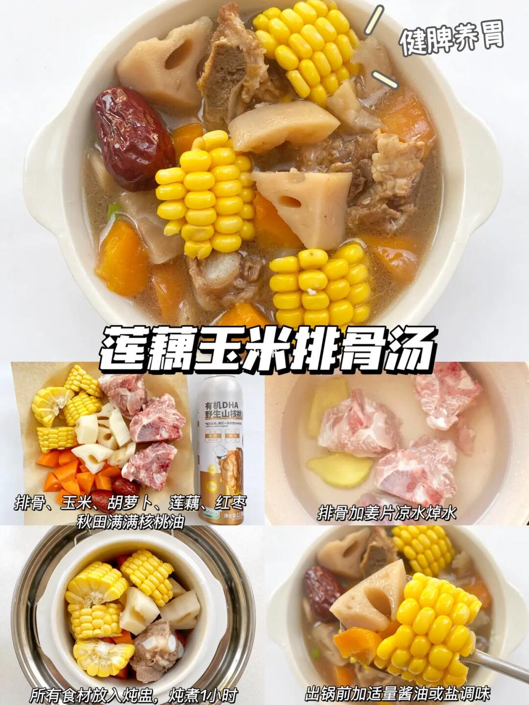 ▪️食材:排骨、玉米、胡萝卜、莲藕、红枣、秋田满满核桃油