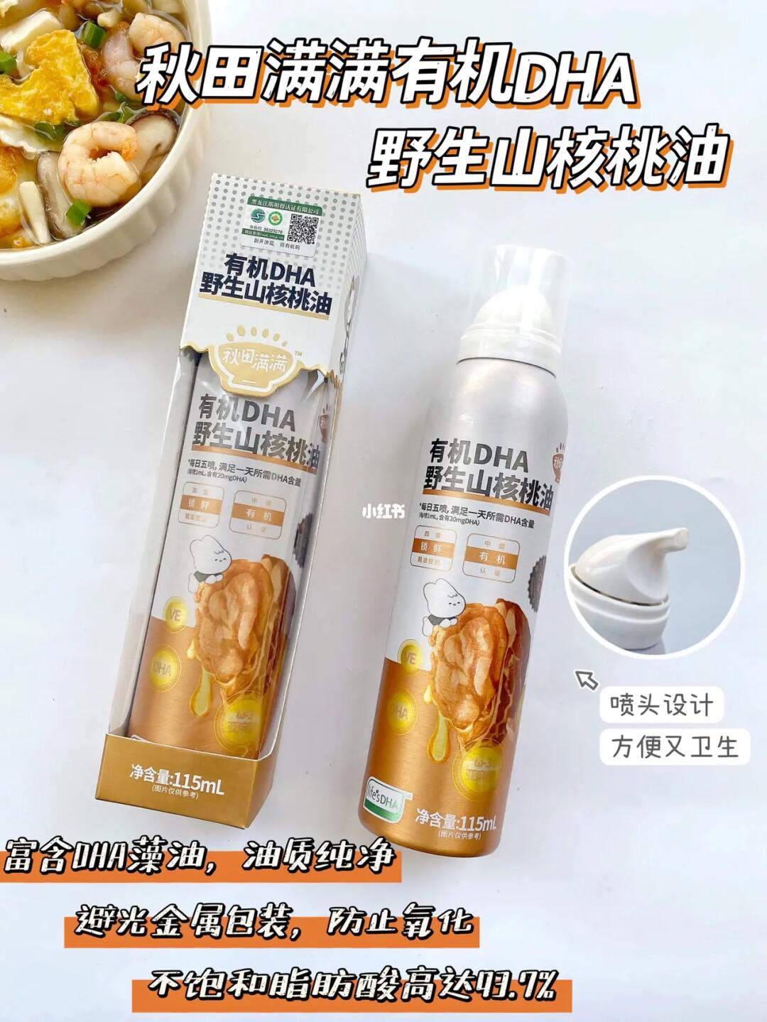 🌟每次喝汤吃面前我都会加几滴核桃油,秋田满满的有机DHA 核桃油要推荐给妈妈们❗️采用的是长白山有机野生山核桃,原生态自然生长营养满满。不饱和脂肪酸含量高达 93.7%,油质纯净不涩口,还添加了荷兰皇家帝斯曼 DHA藻油。❤️喷头设计巧妙又用心,使用起来方便又卫生。平日可以在宝宝各种辅食里添加,增加香味和营养。