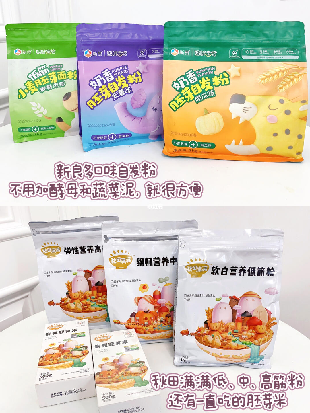 ❤️面粉家里的品种比较多,新良的自发粉用起来很方便,紫薯和南瓜两种口味都好吃,做出来的面食还带奶香味。秋田满满的低、中、高筋面粉和胚芽米也一直在吃,低粉做蛋糕或者松饼,高筋粉做面包。
