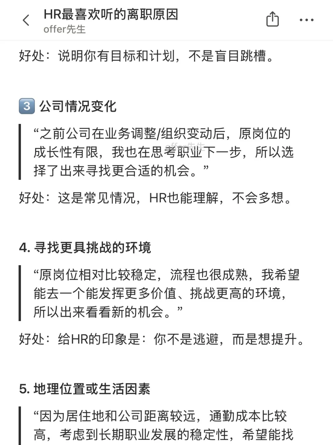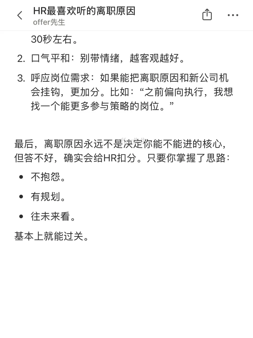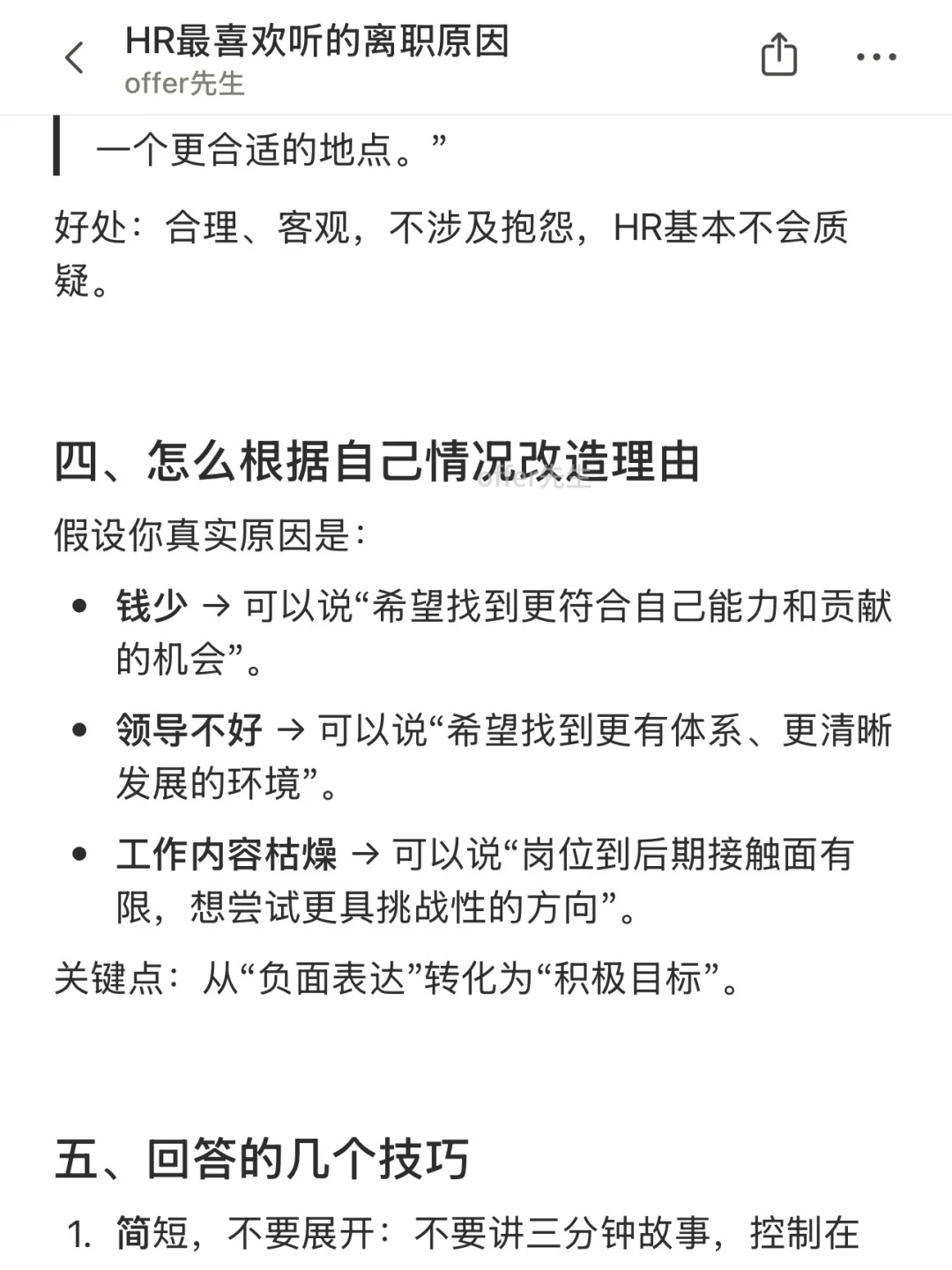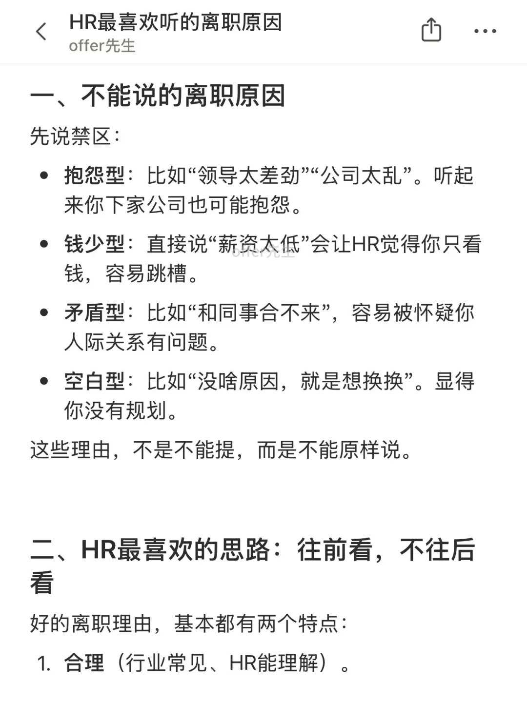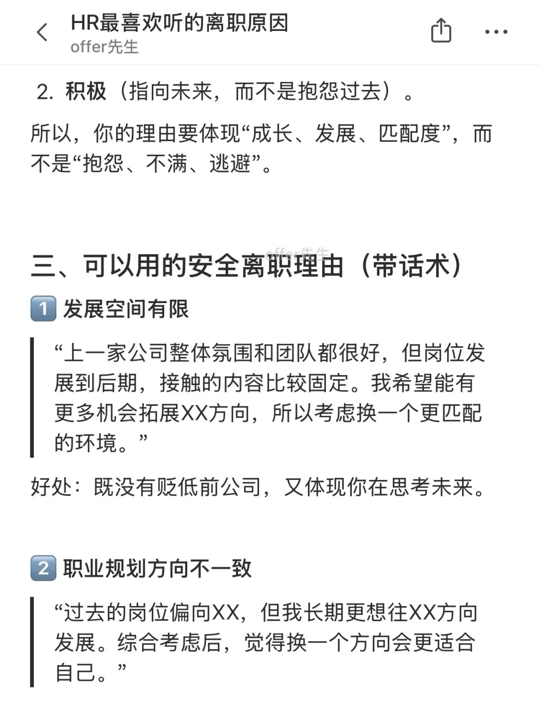 很多人面试的时候,最怕的一个问题就是:“你为什么离开上一份工作?”。一旦答不好,就可能被怀疑:你是不是难相处?是不是能力不行?是不是稳定性差? . 👉🏻其实HR问这个问题,本质上不是想听你“诉苦”,而是想看你: -有没有职业规划意识。 -有没有稳定性。 -有没有沟通技巧(会不会乱抱怨)。 . ☑️所以,不管你真实原因是什么,都要换一种表述方式。具体怎么说,都放在图上了 . 一个认真分享“找工作”干货的账号。真诚、有料、不说空话,只想用真实经历、具体方法,帮大家少走点弯路 .