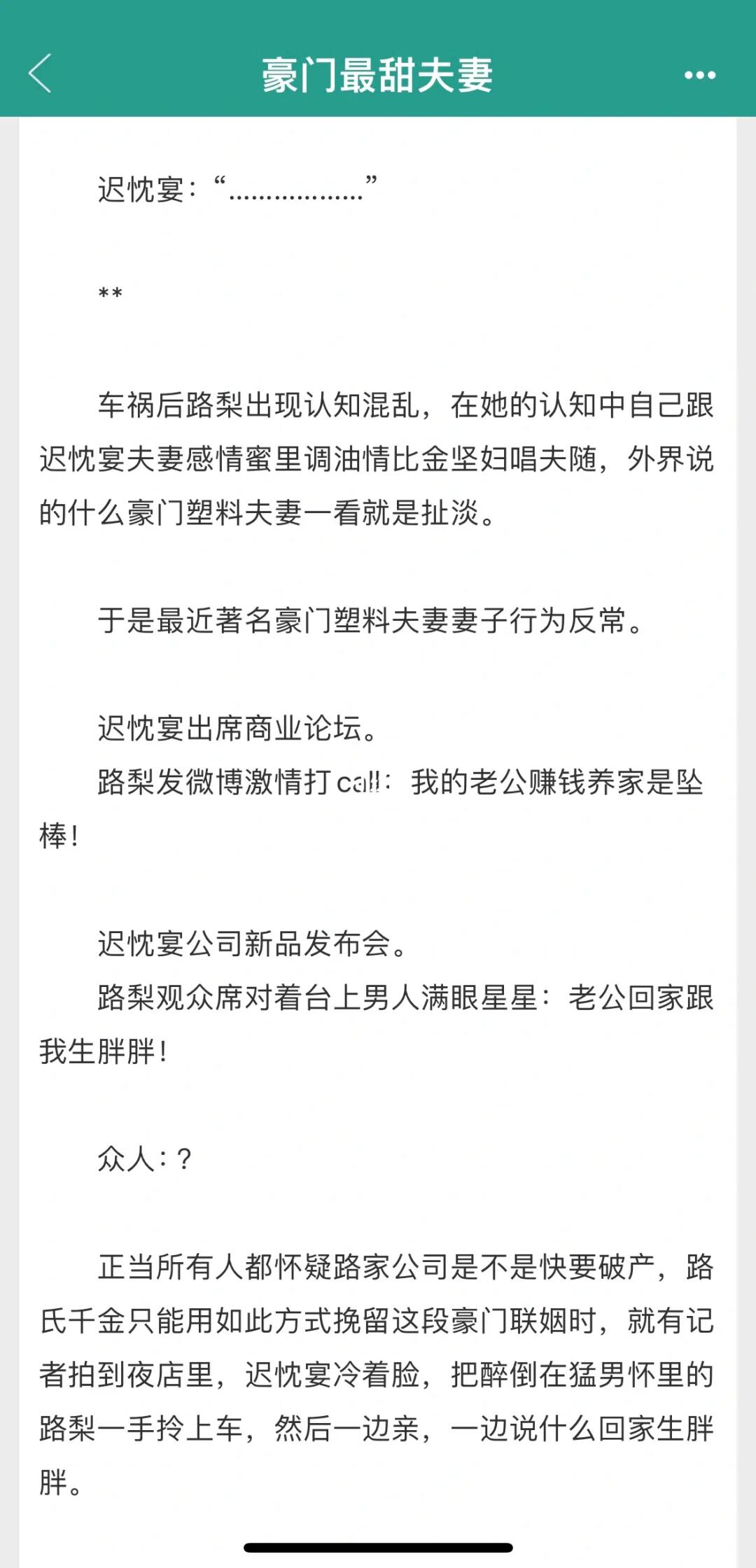 豪门贵公子迟忱宴和富家千金路梨联姻三年 夫妻俩冷若冰霜,以压倒性票数当选豪门头号塑料夫妻。 三年之痒 迟忱宴 正着手拟定离婚协议,路梨突然车祸撞到头。 别的倒没什么大碍,只是车祸之后路梨看他的眼神,好像变了……车祸后路梨出现认知混乱。 在她的认知中自己跟迟忱宴夫妻感情蜜里调油情比金坚妇唱夫随。 于是豪门塑料夫妻妻子行为反常。 迟忱宴公司新品发布会, 路梨观众席对着台上男人满眼星星:老公回家跟我生胖胖! 众人:?