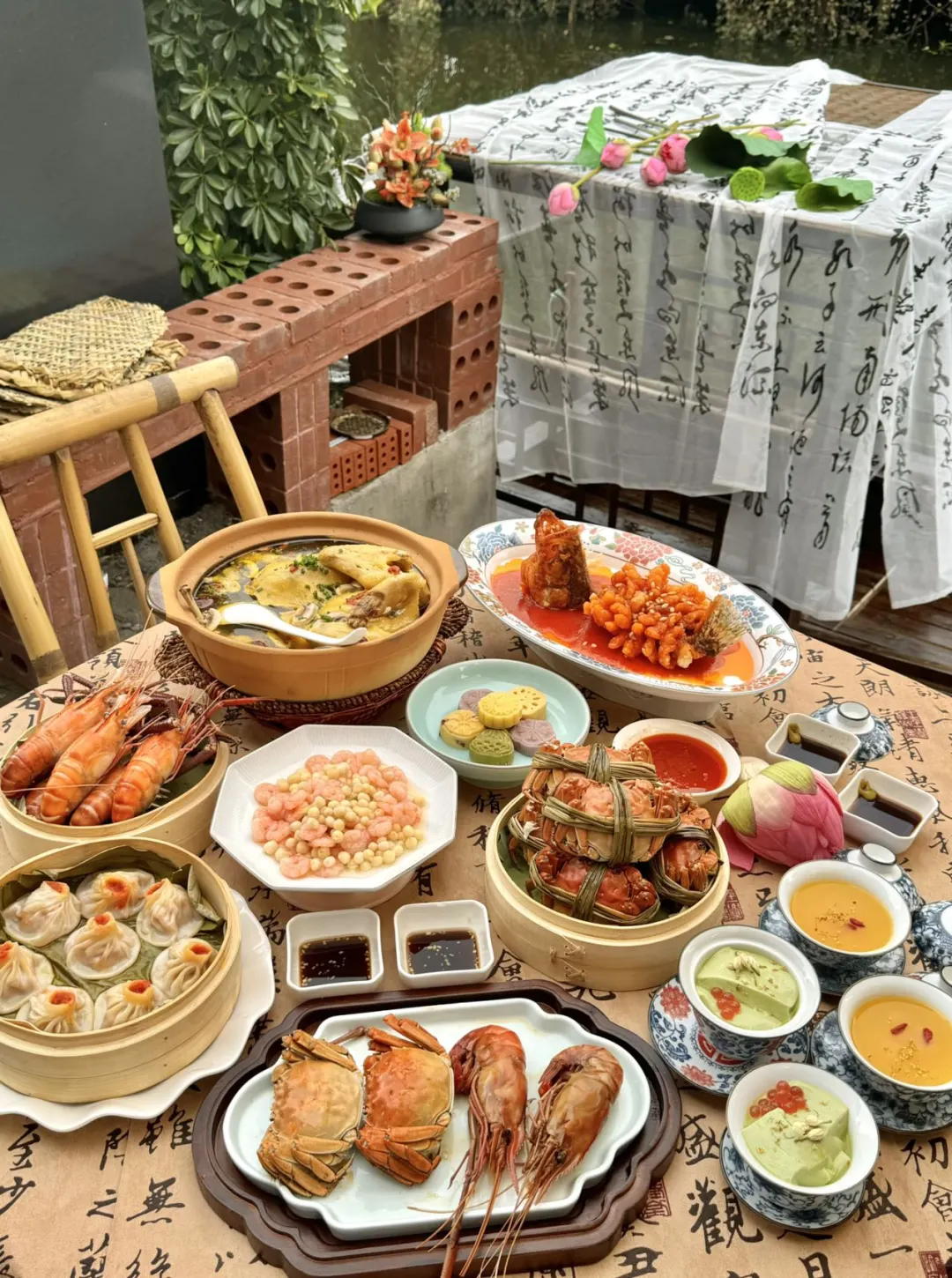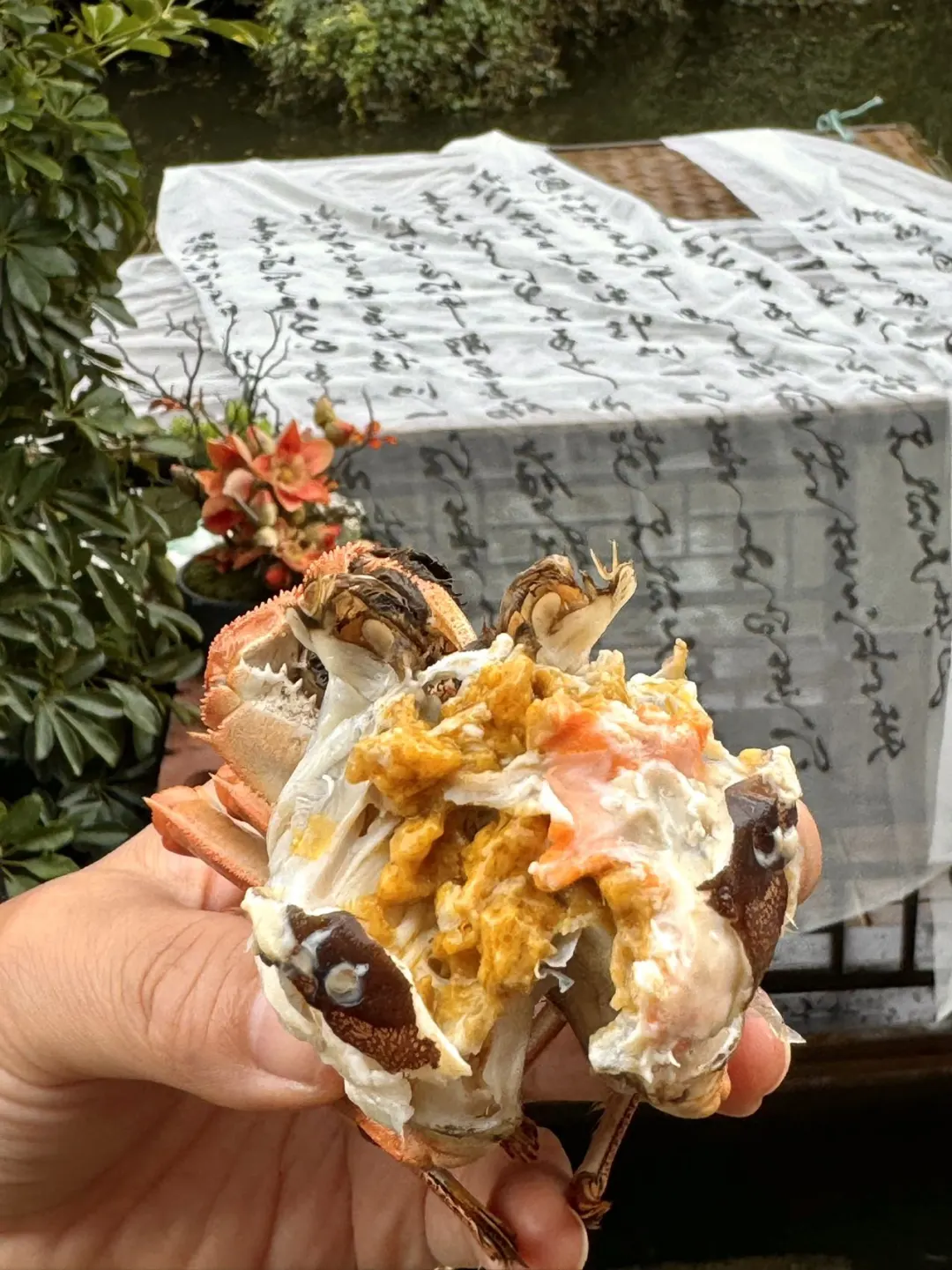 又到了上莲花岛吃蟹的季节了… 绝美湖景位视野超赞 吹着风,品着蟹,有多幸福不用我说! 大闸蟹个头已经很大 金黄饱满,看着就很诱人 掰开后满满的蟹黄醇香细腻 阳澄湖一号大虾足足有一个手掌那么大 肉质紧实Q弹,吃着好过瘾