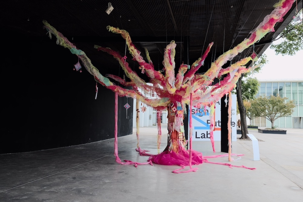 在上海西岸艺术中心A馆外,一棵多彩鲜活的粉色树木颇为引人瞩目,这是中国美术学院社会美育学院“种下”的“疗愈树”。对应到场内的展览“云朵的秘密——疗愈树”,这是一个走出学院教育,对于普通人心理状况进行观测和关怀的作品。