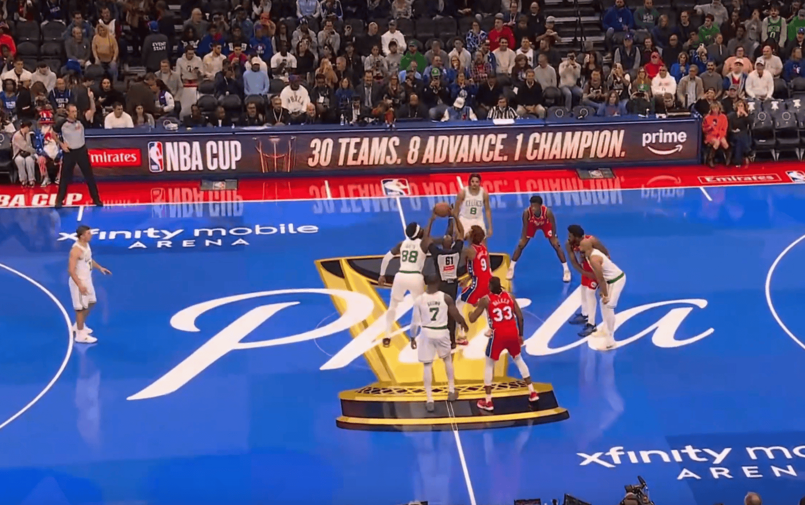 开场76人派乌布雷与克塔跳球,恩比德与普里查德对位